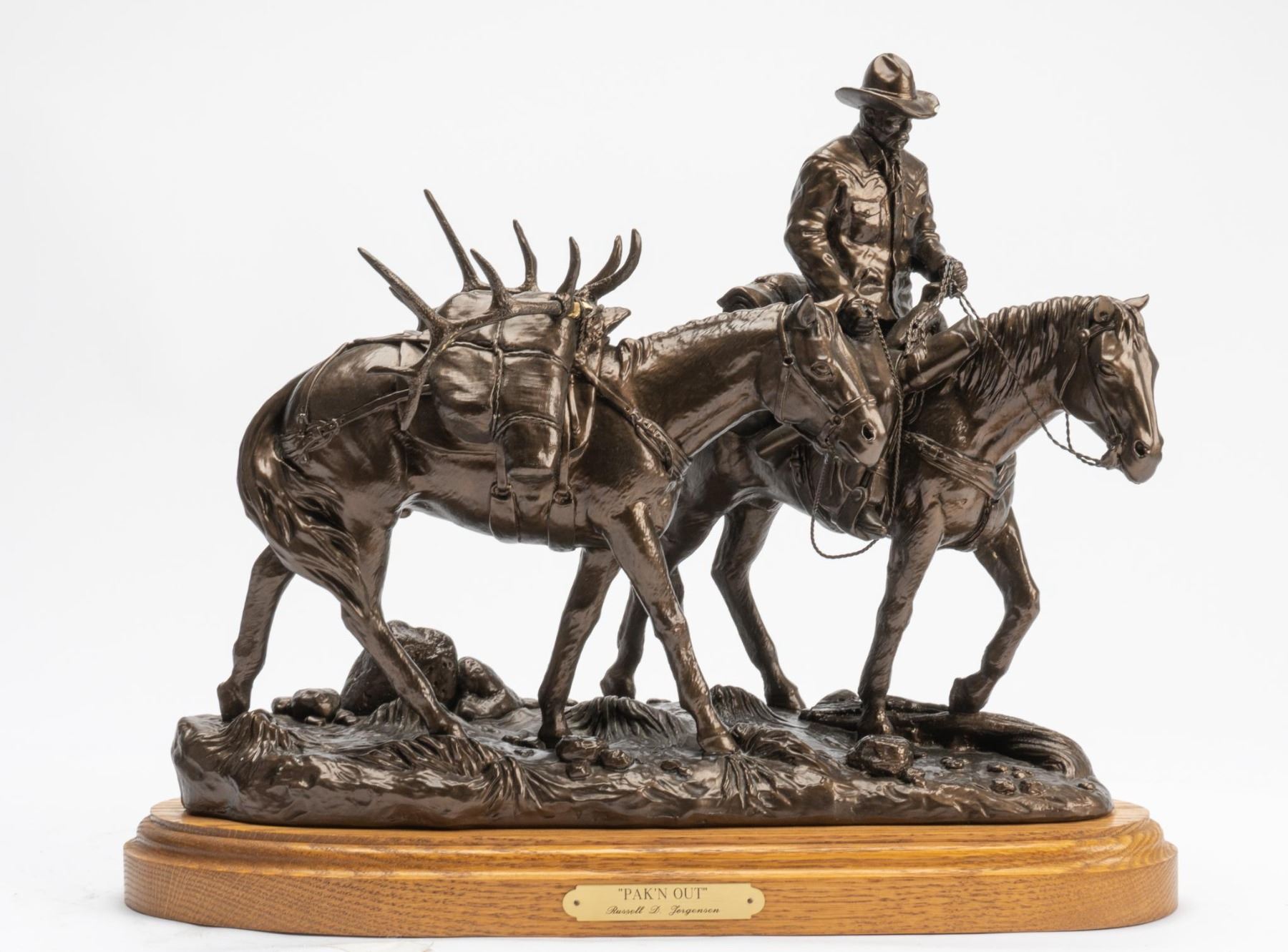 Vintage 1995 Russell D Jorgensen "PAK'N OUT" Pack Horse Sculpture. The sculpture is of a rider packing out an elk with a brass tag on the front of the sculpture that reads - "PAK'N OUT, Russell D Jorgensen. The sculpture is made out of cast resin with a wood base. The sculpture measures approx. - 14" tall by 18" wide by 8" deep and weighs about 20 pounds. # 1364 of 1450.