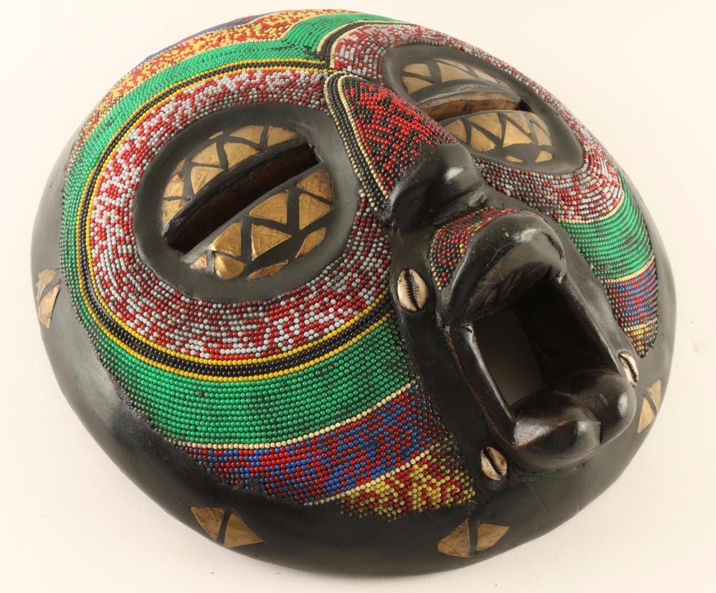 Measures 14 1/4"w x 15 7/8"h. The front is constructed with multi colored beads, inlaid brass and sea shells. Everything is mounted onto a hand carved wood base. Absolutely fantastic detail with hours of hand work spent making this piece.