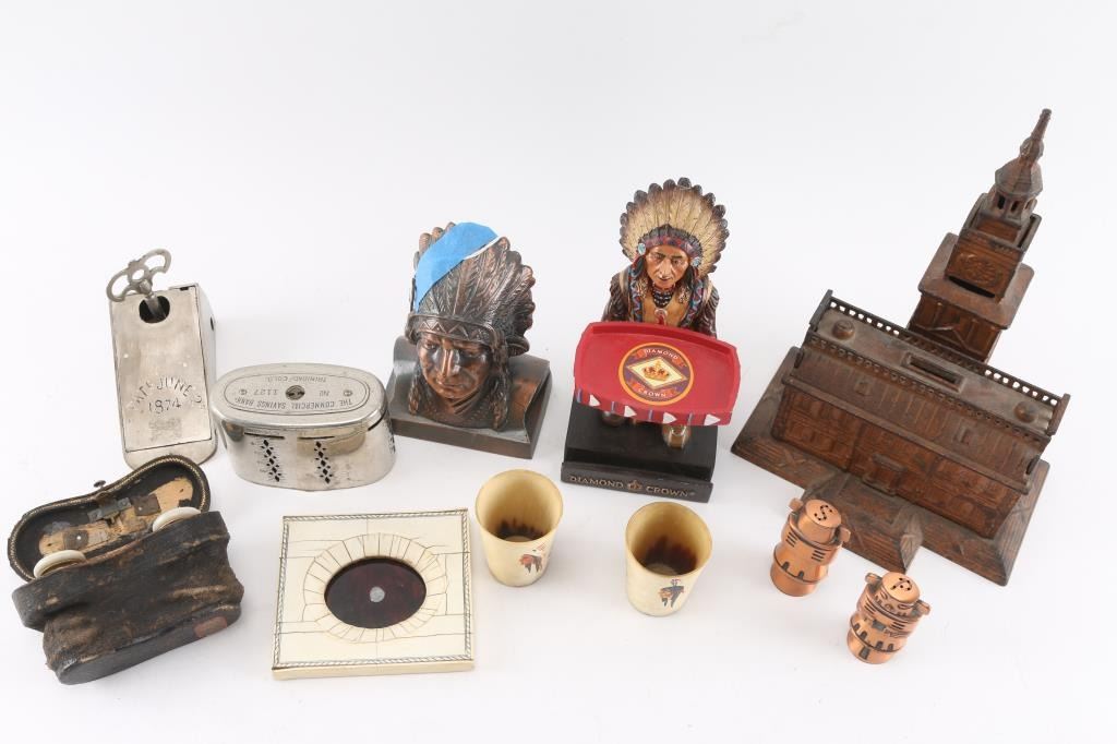 (3) Vintage banks; Diamond Crown resin cigar advertiser; pair of horn painted shot glasses from Yosemite National Park; antique desk bell dated 1874; pair of mother of pearl French binoculars with case; pair of copper kachina bottle stoppers; bone inlaid Daguerreo type frame.
