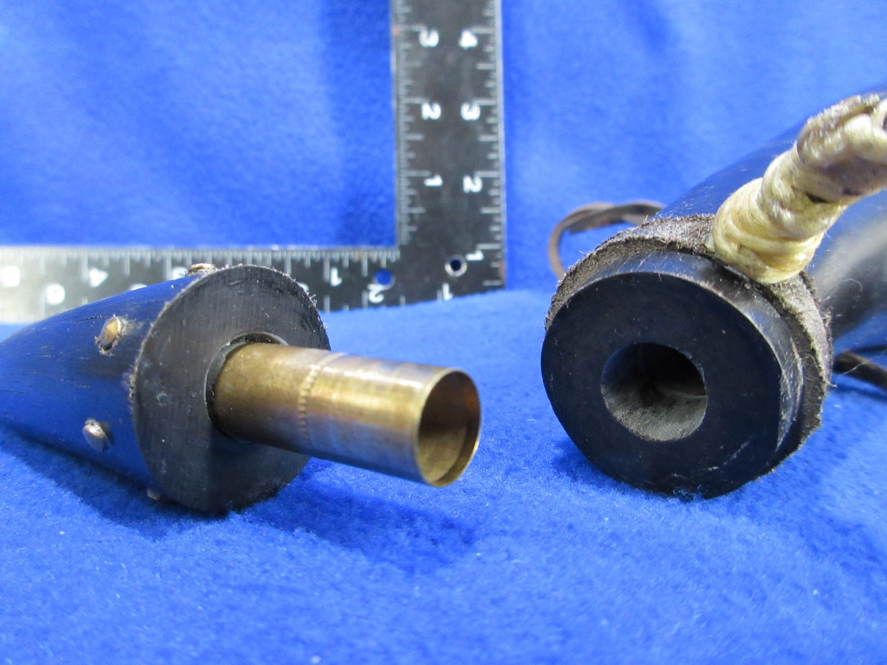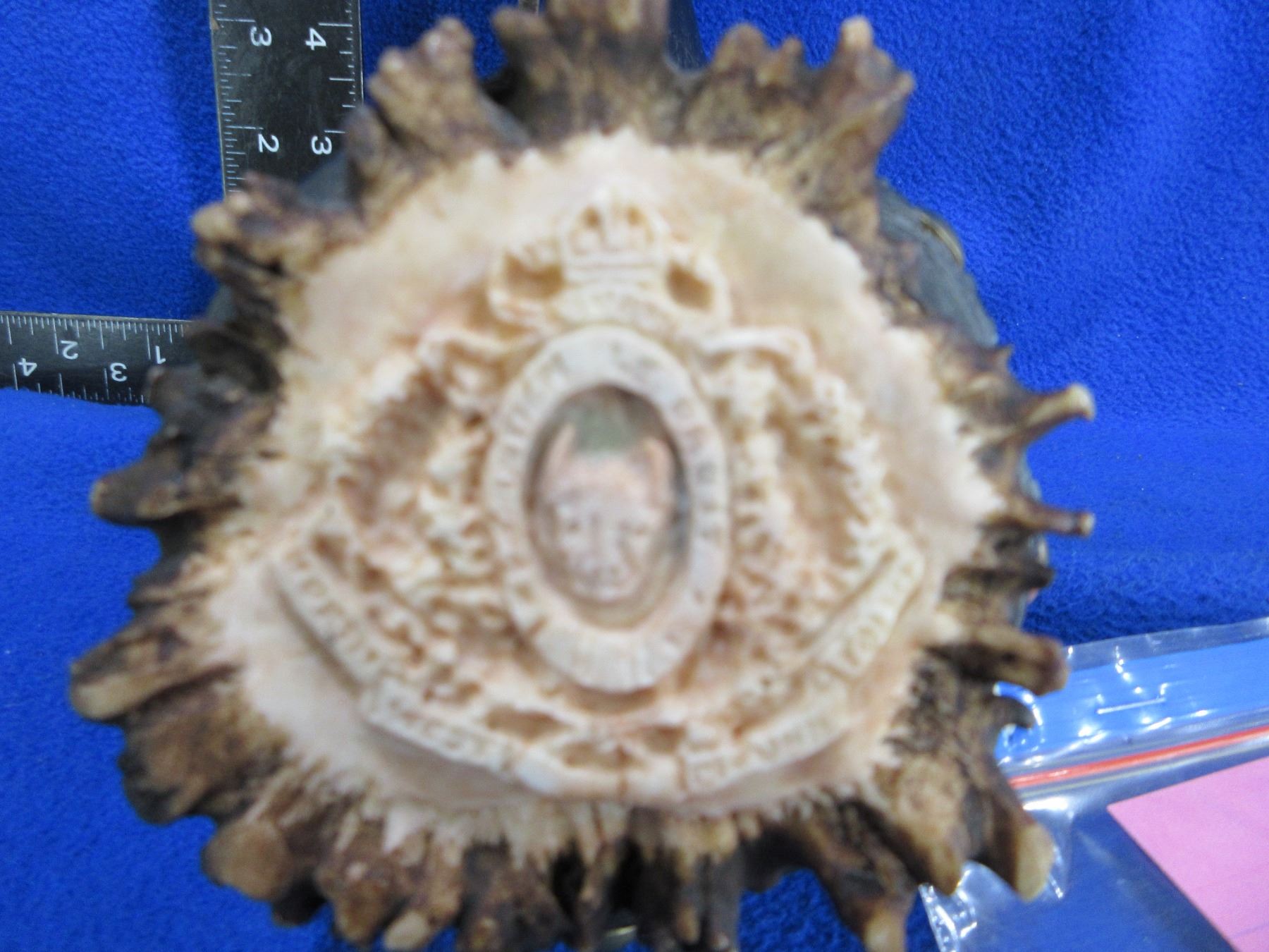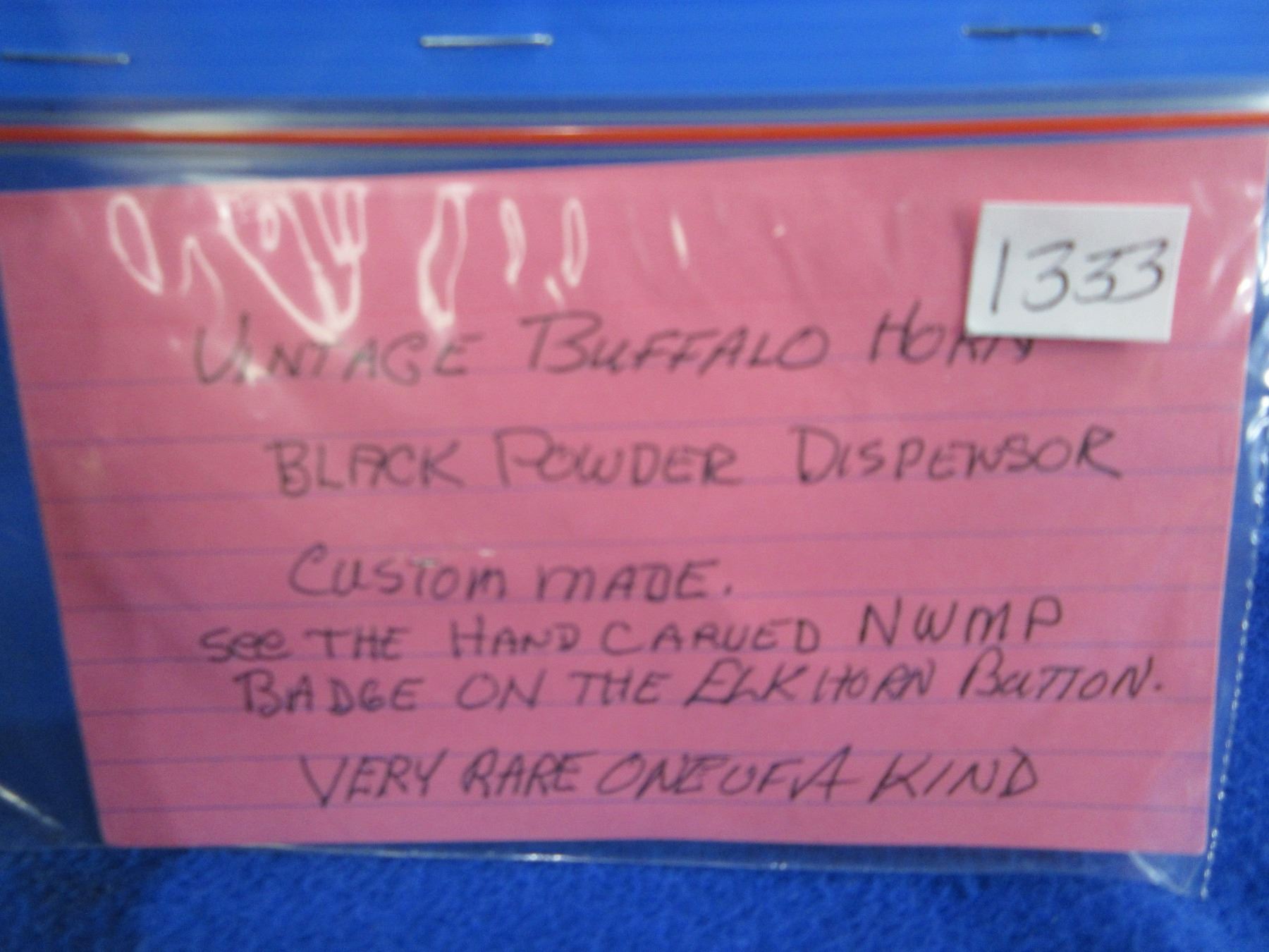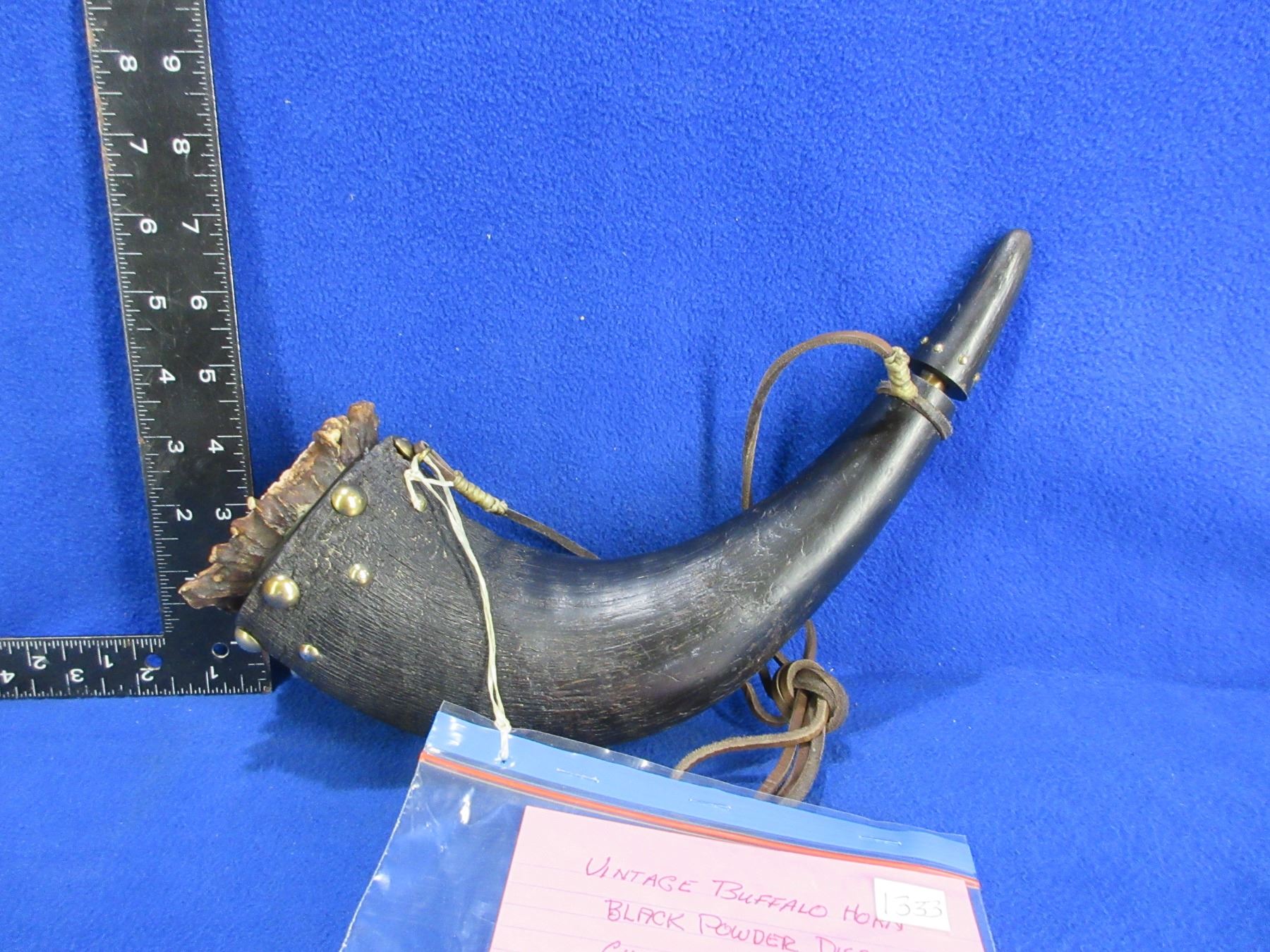 Vintage Buffalo Horn Black Powder Horn with Hand Carved NWMP Badge on the Elk Horn Button