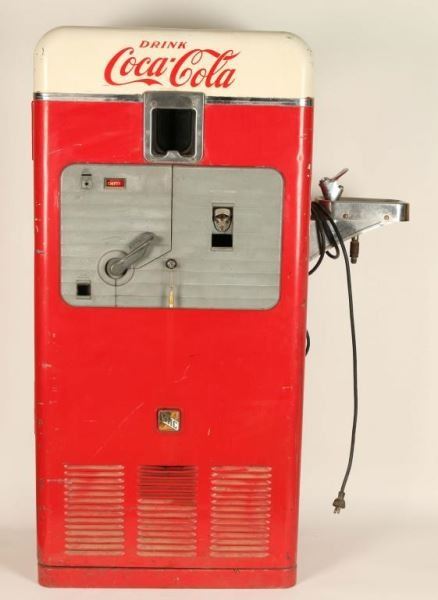 Made by VMC with stainless steel drinking fountain. 1950s-60s era in all original red and white paint. Dispenses glass bottles. Measures 51"h x 41 1/2"w x 15"d. Includes original key.