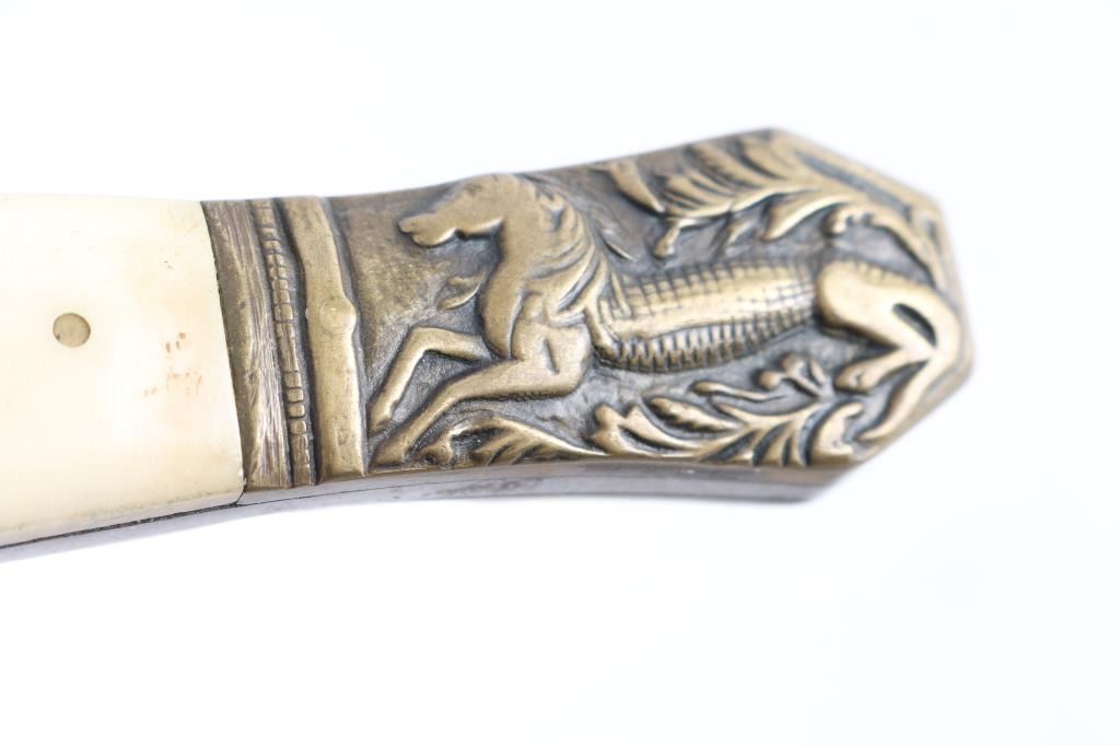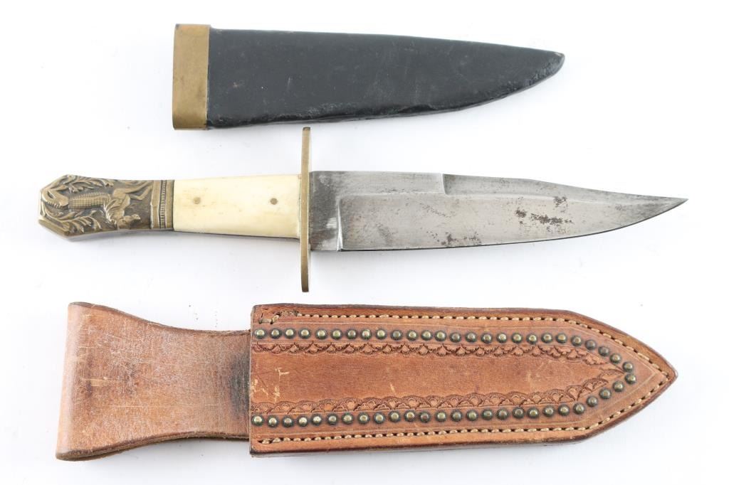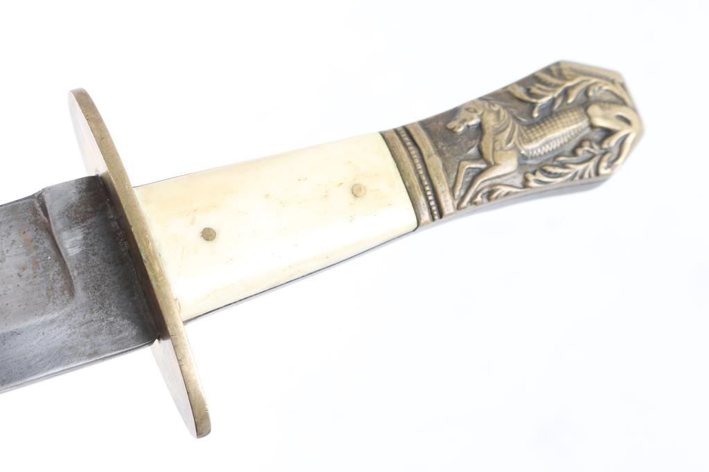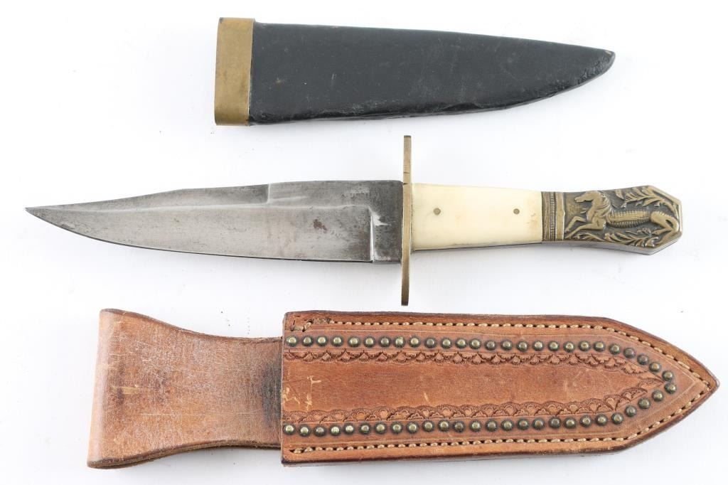 in very good condition, unmarked, with "Half Horse - Half Alligator" motif on pommel, per a quote attributed to Mike Fink, by Davy Crockett in his almanac, that Fink stated "I am half horse, half alligator,. and I can whip any man on the Mississippi, by God!". Blade is 6", 10-3/8" overall, clip point, brass fittings, bone scales. With a studded leather belt sheath, and a black leather sheath with damaged brass locket.