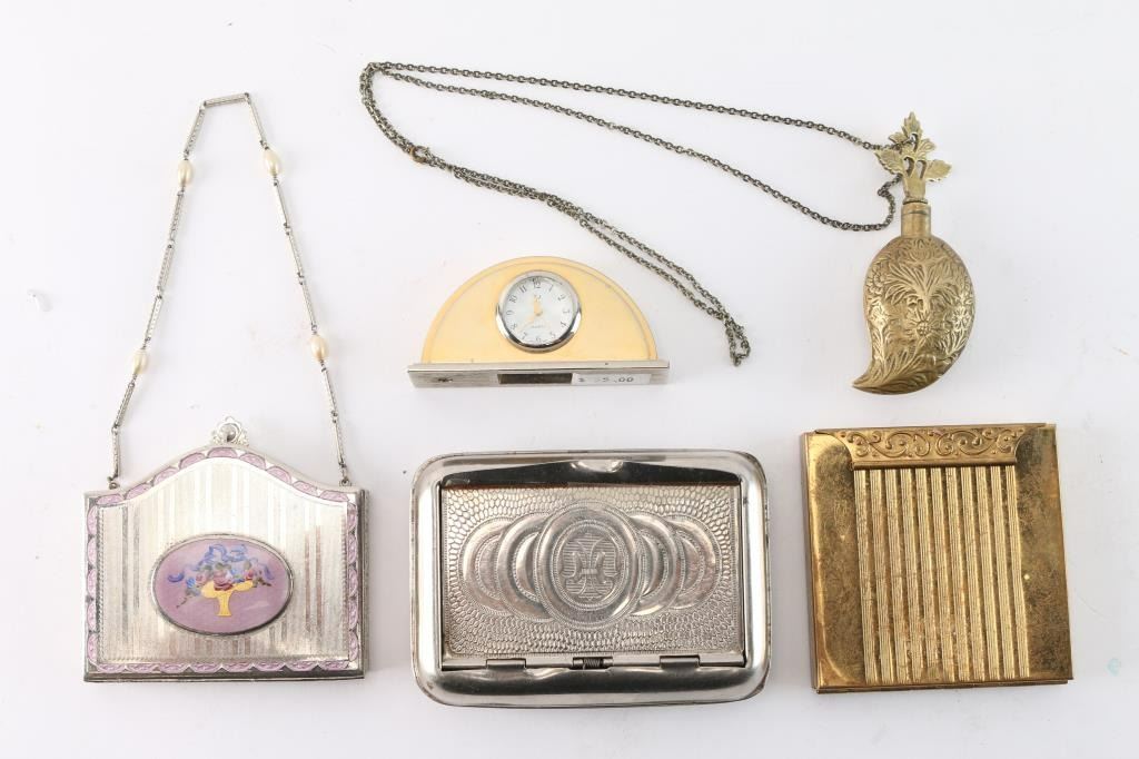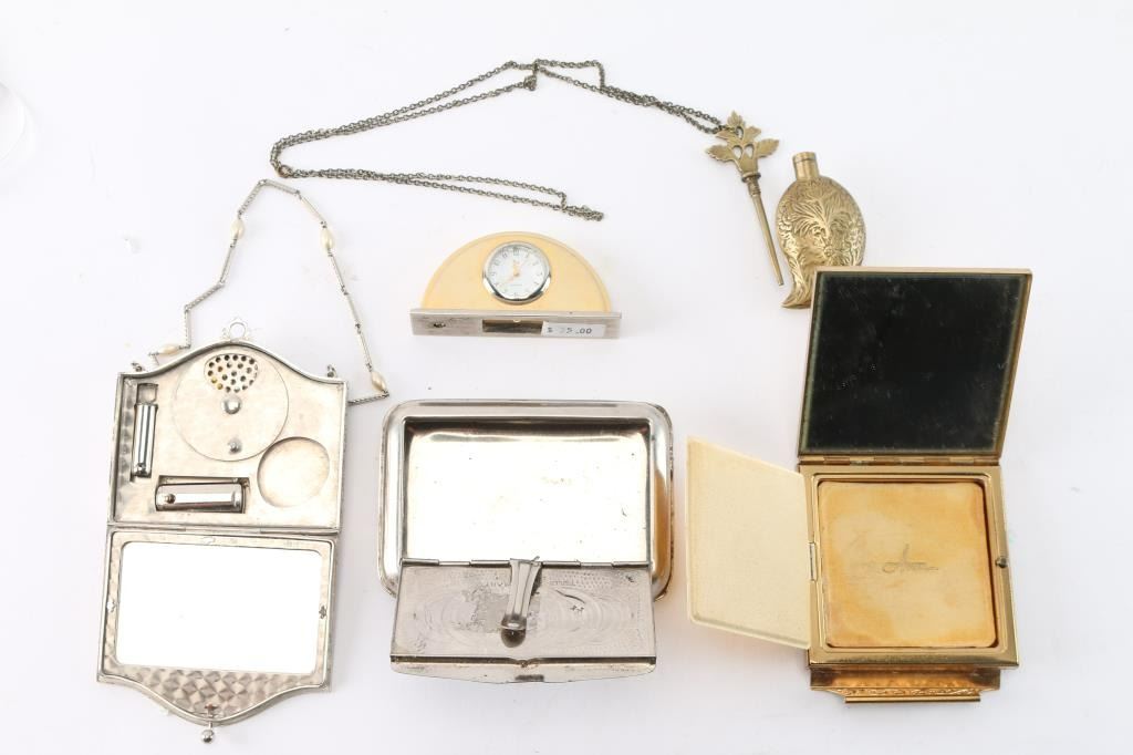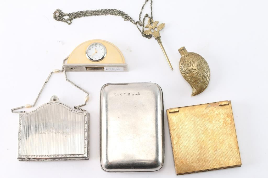 Includes ladies' portable purse ashtray, silver tone, some bending to rim, "Hutson" etched on bottom. Also includes Avon gold tone powder compact. Also includes silver tone mirrored makeup compact with mini perfume bottle among other things, with chain handle. Also includes brass perfume bottle necklace. Also includes miniature gold tone quartz desk clock.