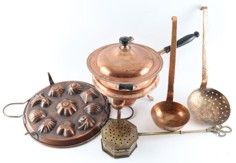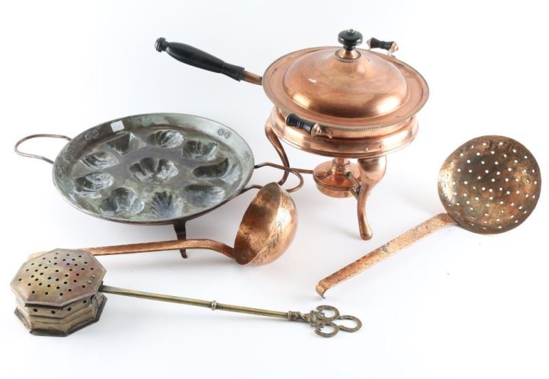 Including chaffing dish made by G T Sutterley and Co, Philadelphia, PA. dated 1906. Also included is a handmade copper ladle and large handmade straining spoon and a brass chestnut roaster. with handle showing 3 horseshoes and buck motif. Also includes and an antique copper jelly mold.