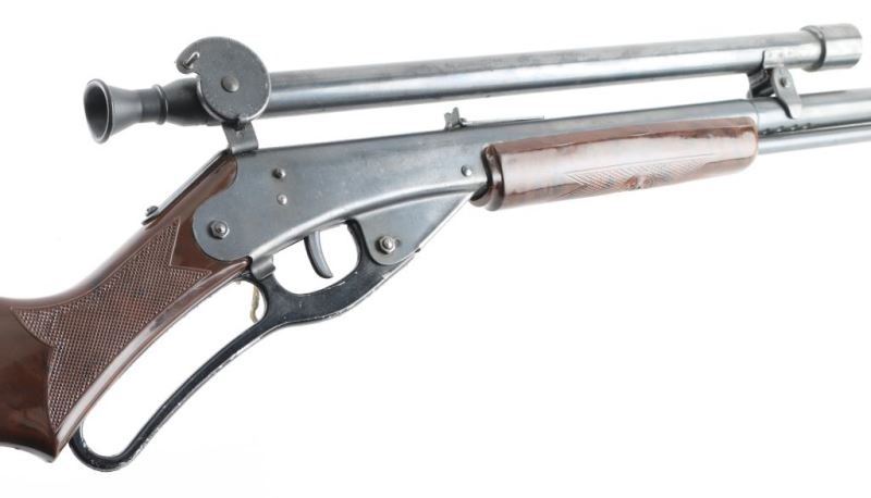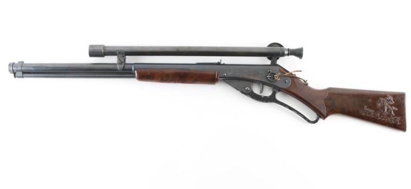 Features blued metal, brown plastic forend & stock with checker panels and embossed "Red Ryder" logo, saddle ring with leather thong. Metal finish is good condition, with chips and scrapes, little patina but no rust. Plastic is good solid condition with minimal blistering, no visible cracks. Scope is good condition with clear view, vertical post reticle, quick adjust elevation wheel.