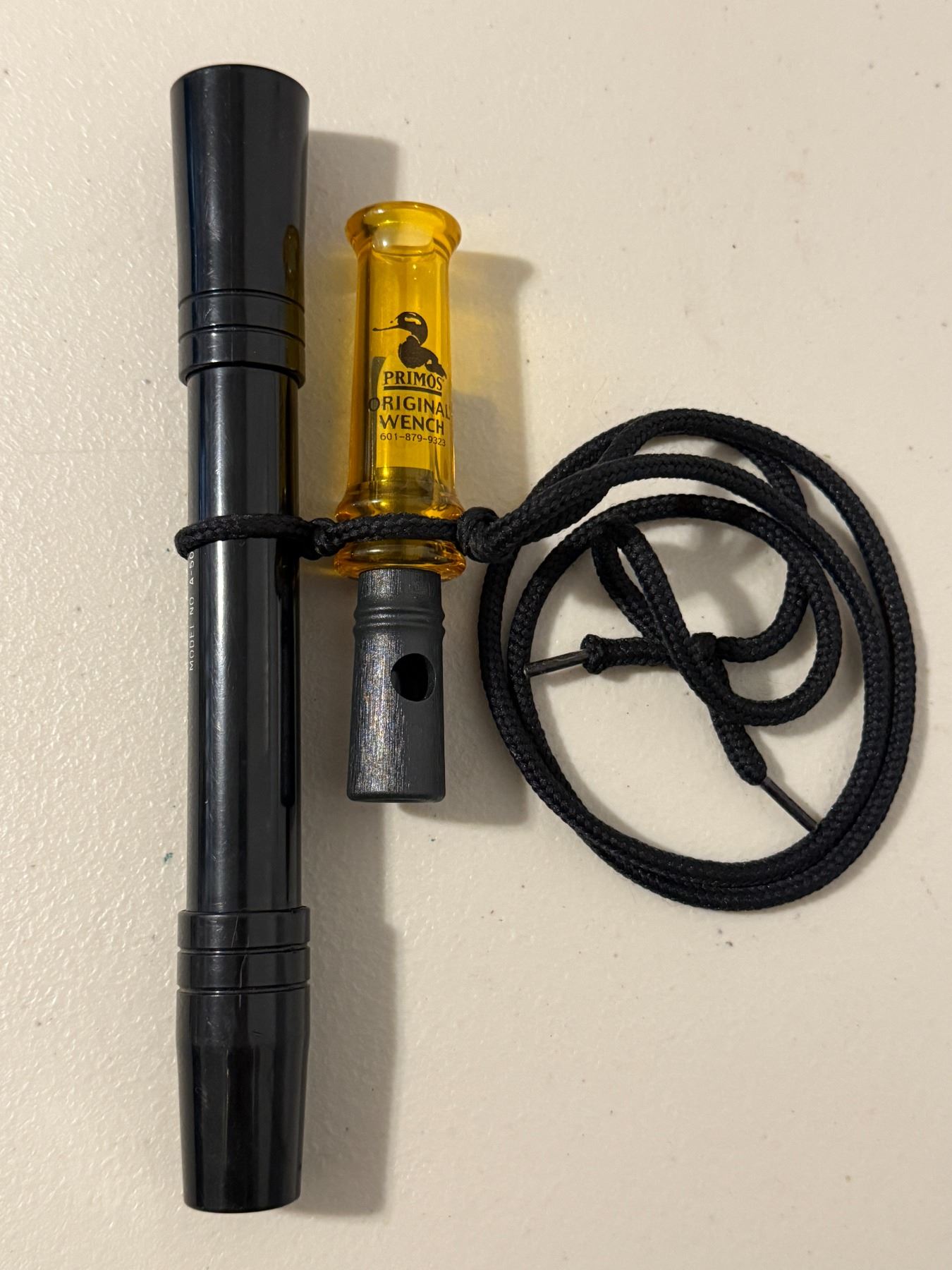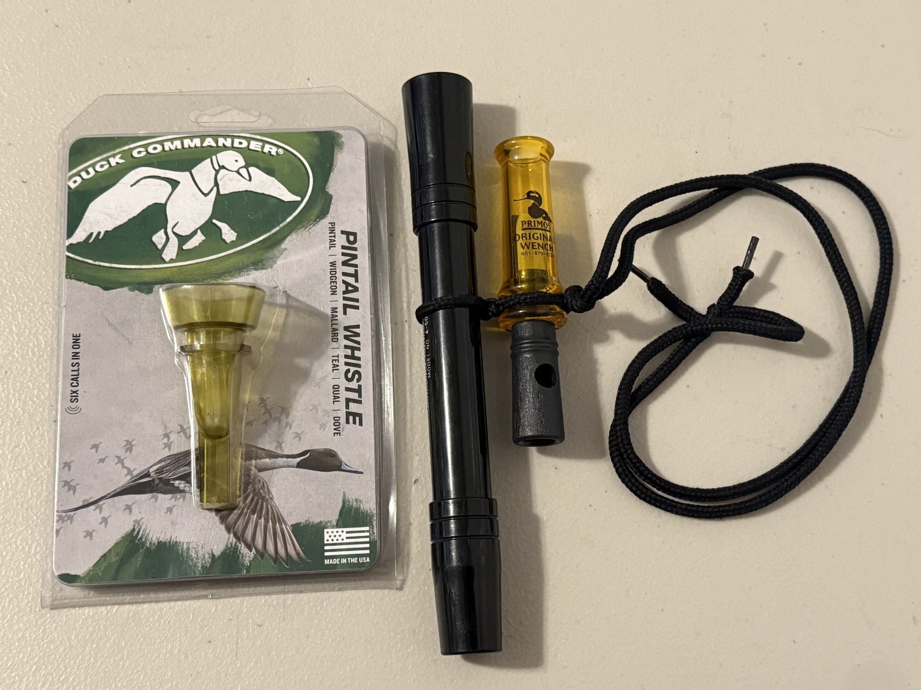 Assorted duck calls including Duck Commander and a P.S. Olt Canadian Honker (Model A-50). Mixed materials and styles. Condition as shown. Great hunting or collector lot.
