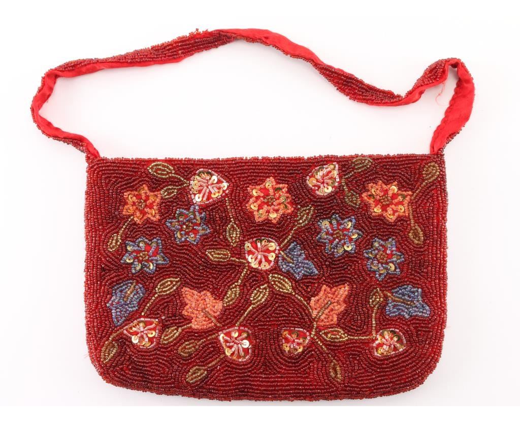 with floral motif with dark red base accented with blue and orange sequins. Snap closure in good condition