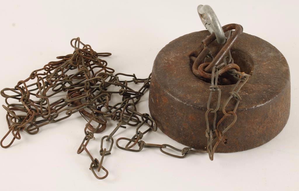 Metal weight with carabiner clips and chain.
