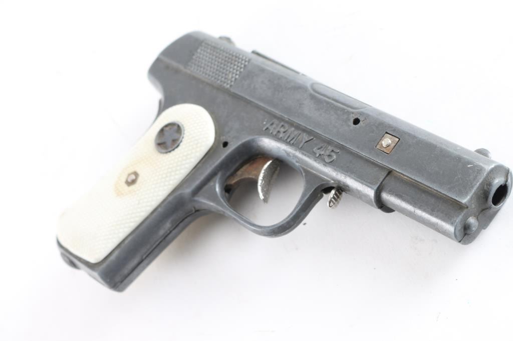 Wonderful vintage rare1950’s Hubley “Army 45” colt style Toy cap gun replica pistol, white plastic with embossed star. 50 shot with pop up cap loader. The gun works properly. Made in the style of a Colt Model 1903 Hammerless. The plastic grips are a little warped.