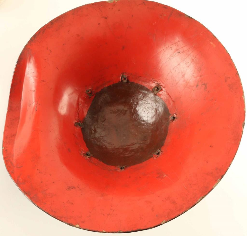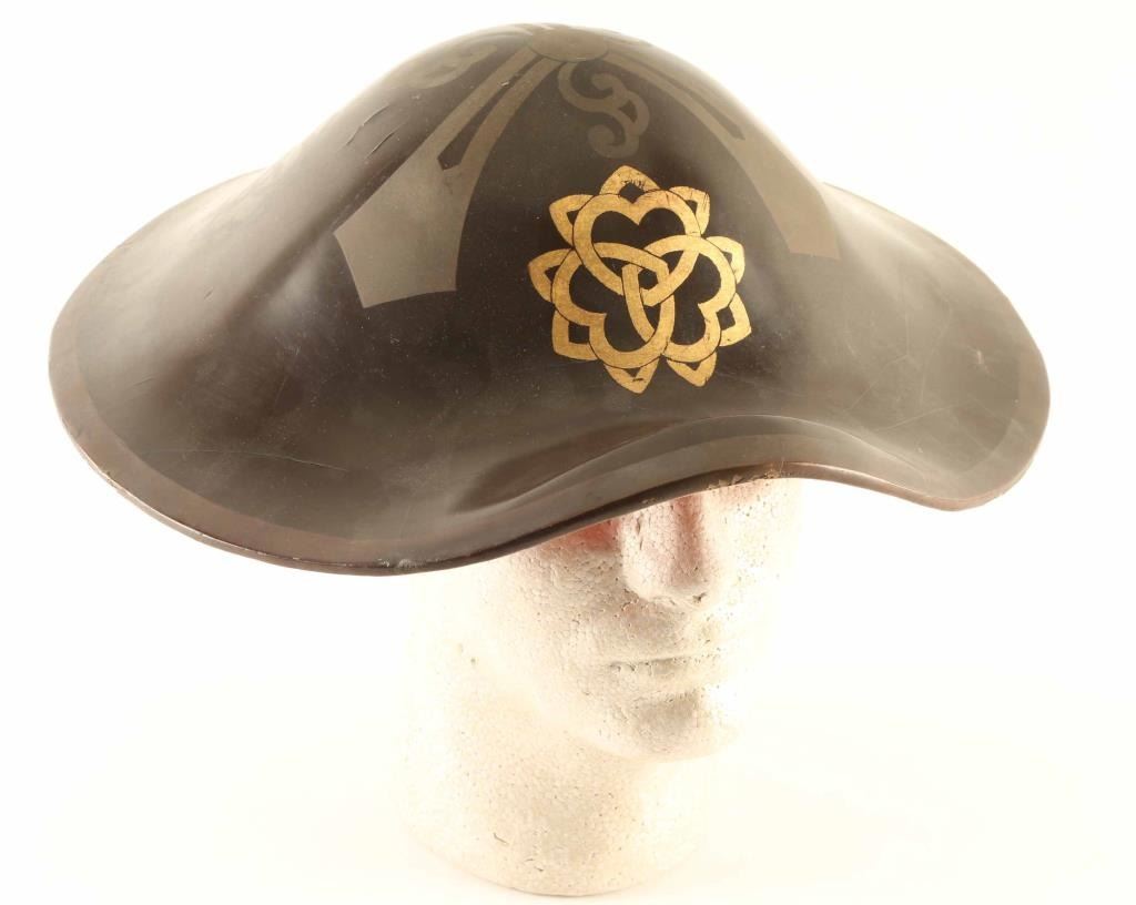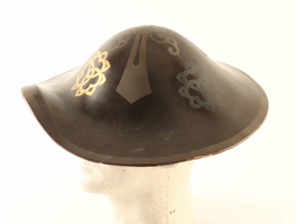 Japanese light weight military hat worn by Samurai, and soldiers. Made from layers of paper glued together, and then lacquered to waterproof, and hold the shape. This one is brown, with hand painted symbols, including a gold symbol in front. This is the samurai Family Kamon (symbol), or the "Mon" of the Daimyo he serves. No liner. Some cracks to the lacquer, nothing serious.