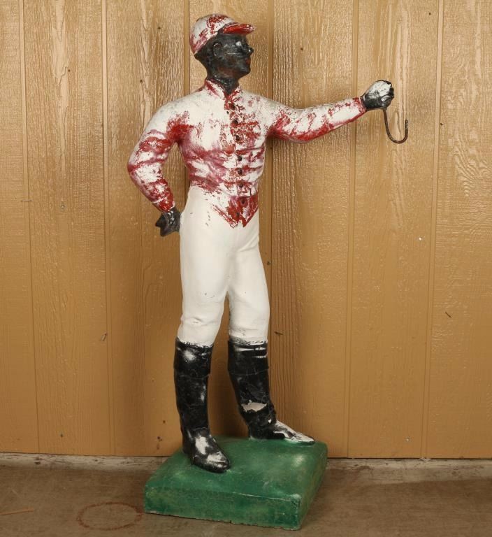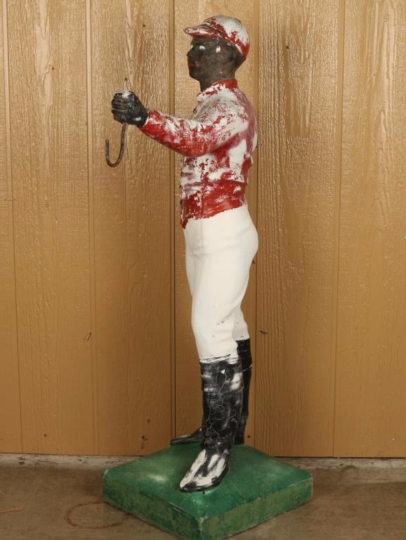 Concrete construction with hitching post. Measures 43"h x 17"w at base. Fair condition, shows losses to paint and some cracking. Great yard art!