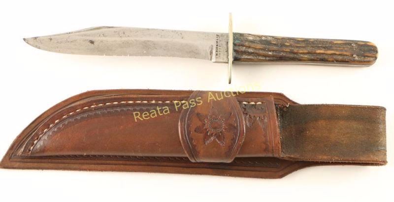 Sheffield England 1870-1912. Measures 9 1/2" overall with a 5 7/16" blade. Dark jiggered bone handle with a silver guard. Comes in new custom leather sheath.