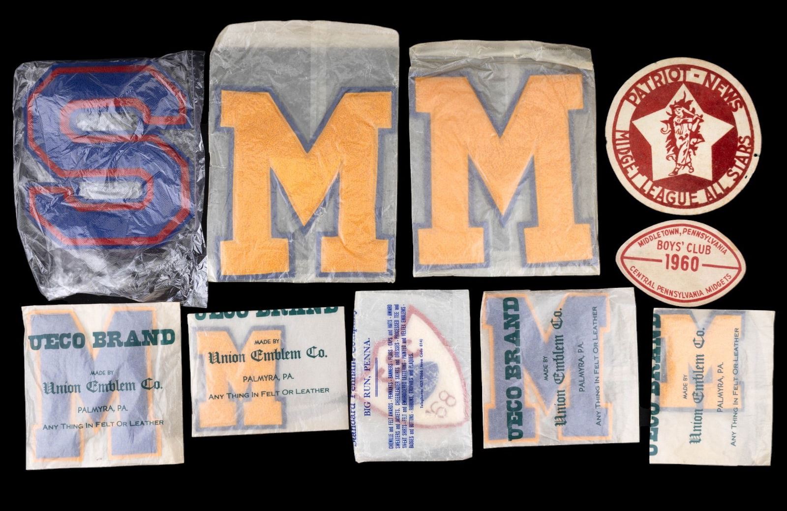 Assortment of vintage 1960s Middletown High School & other high school varsity letter patches, high school football & winter sports schedules, black & white football & wrestling photos (high school & college), & more. See photos for further details. Some ephemera smells musty. Pennsylvania sports memorabilia.
