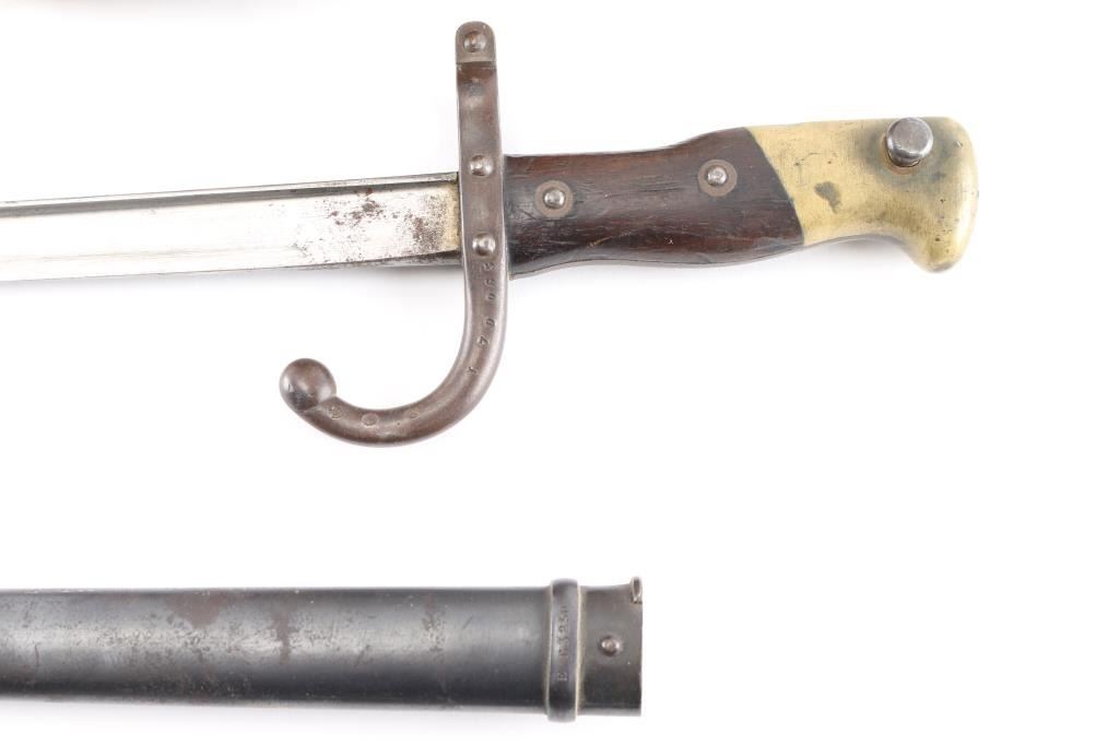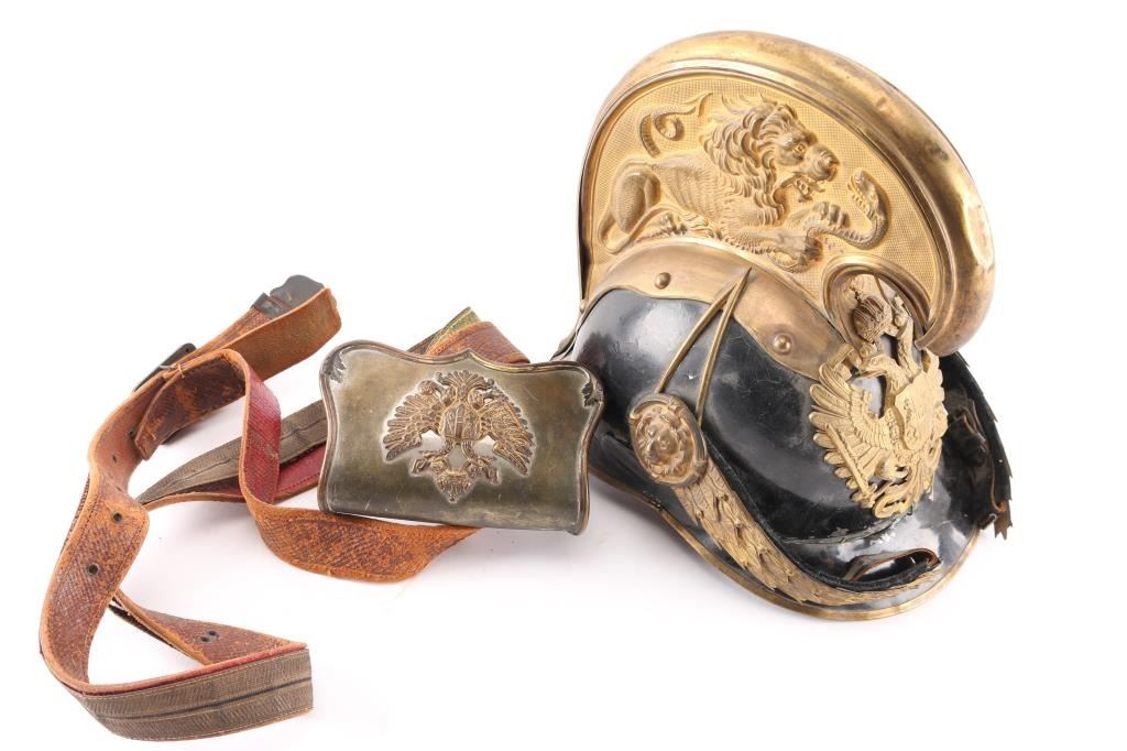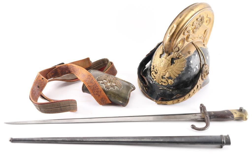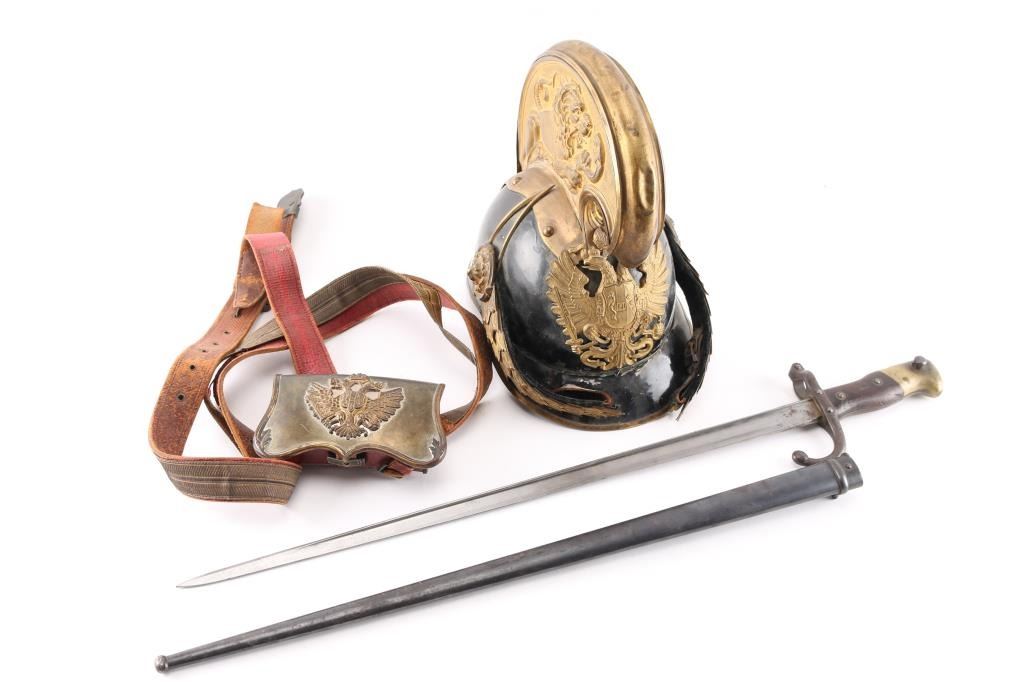 French Lebel bayonet, Austrian officers dragoon helmet & artillery cartridge box.