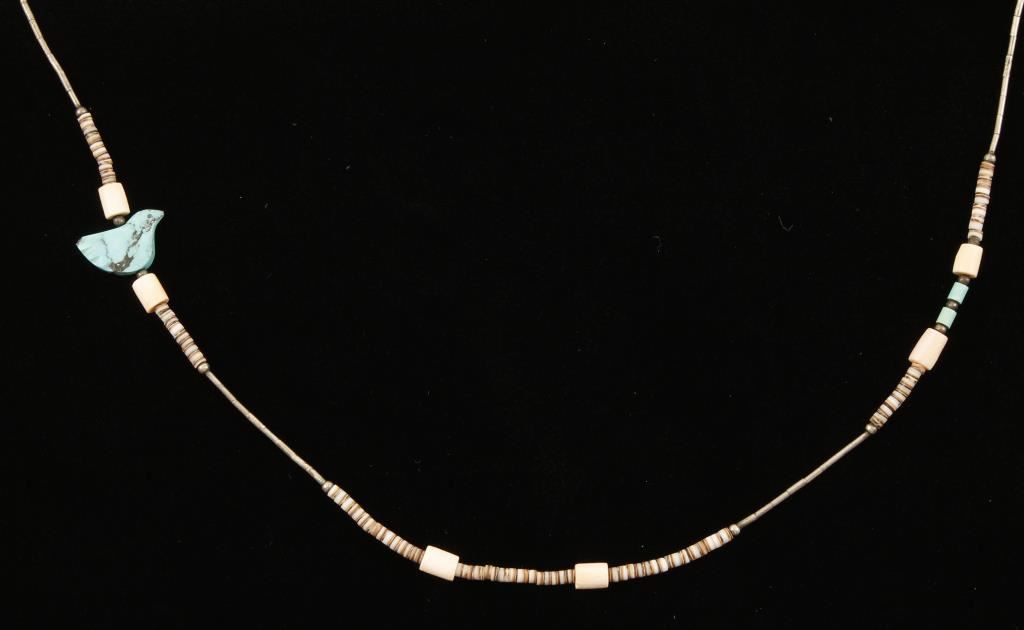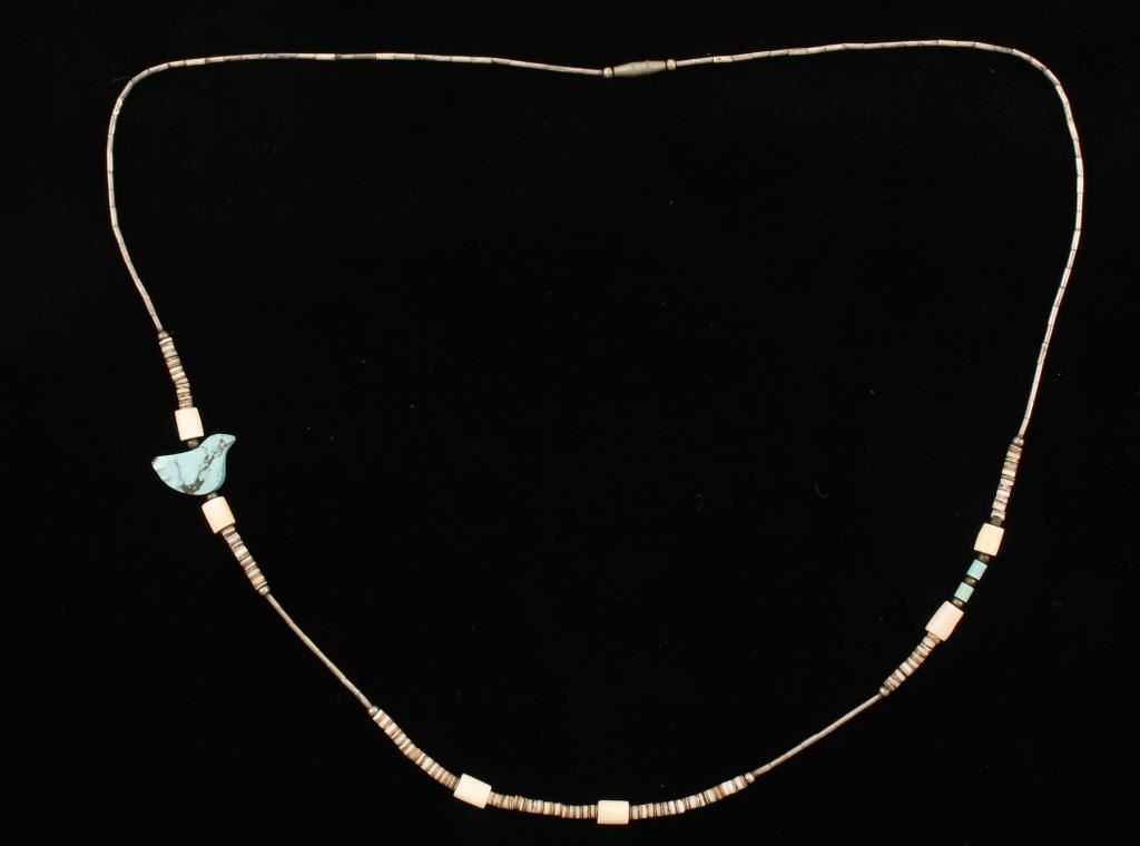 Vintage Native American made necklace with heishi shells, turquoise, shell, silver beads and a turquoise bird fetish. 24" in length.