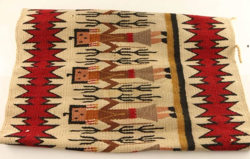 Bright red border surrounds Yei figures. Measures 63 1/4"w x 31 1/2"h Shows some wear, small holes. Excellent for display,.