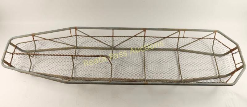 All metal construction with chicken wire basket and tubing for frame. Measures 84"l x 24"w x 7"d.
