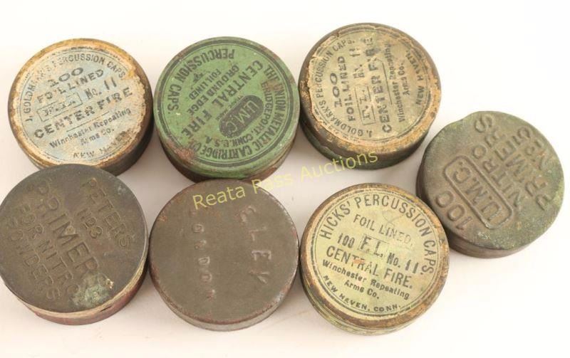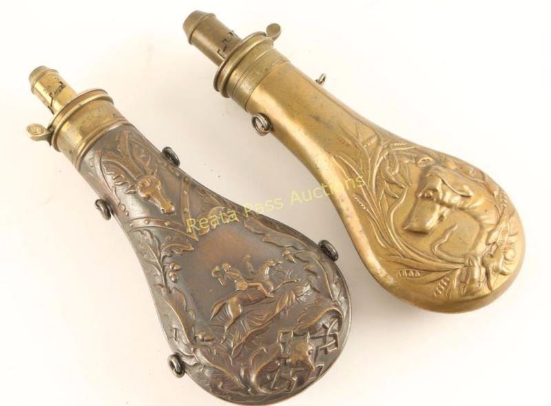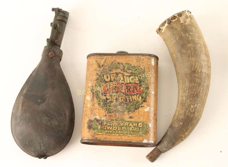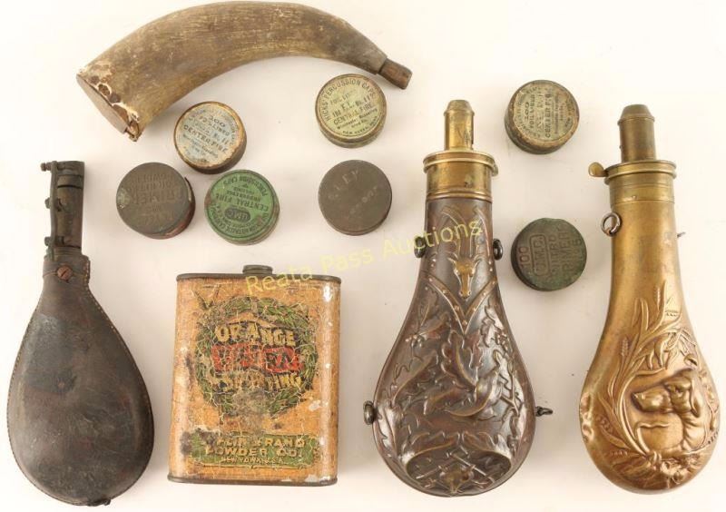 Includes a 'G&J.W. Hawksley' brass powder flask, a leather shots flask, priming horn, an orange extra sporting powder tin, several antique percussion tins and a brass powder flask with hunting dog scene marked 'G. Roe'. Interesting collection. All appear to be original.