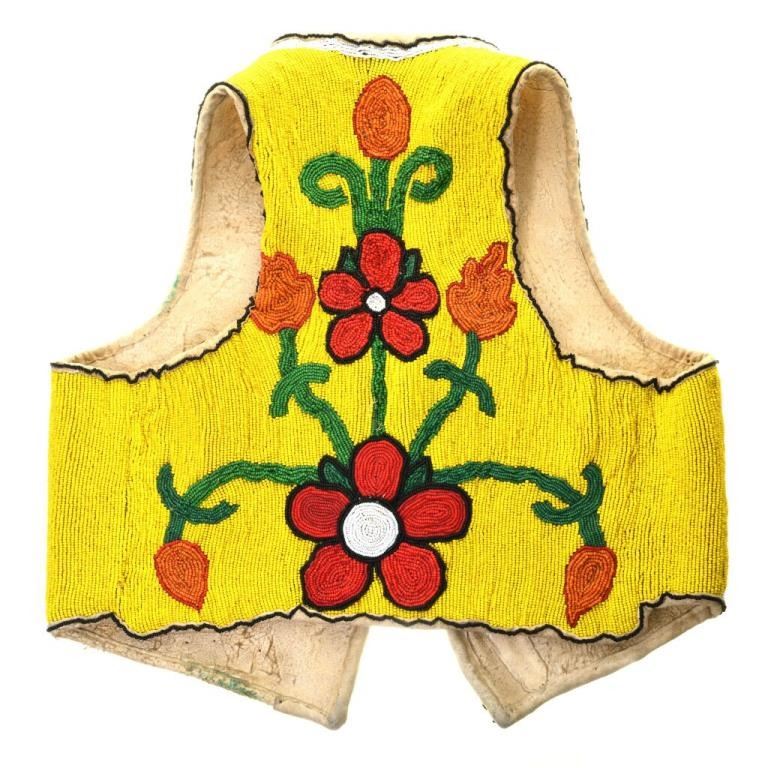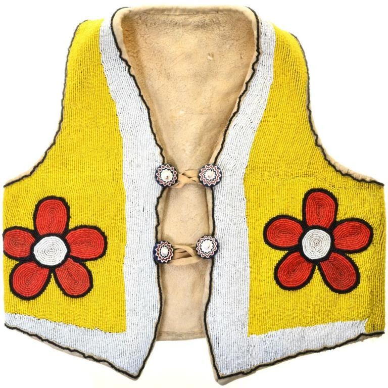 Cree Flower Pattern 20th Century. This Plains Indian Beaded Leather Vest is a really nice collectible that can be worn or displayed! Hand made, it has a very sturdy construction in both the leather and beading. Flowers abound on the back with a complementing motif on the front. The glass beads include, red, white, orange, yellow, green and black....the design is dynamic! All the seams & beads are hand sewn. Four large buttons with leather loops close the front. It has been worn and there is normal wear and tear with some minor bead loss on the back center. This Plains Indian Beaded Leather Vest is one of a kind & an authentic piece of early, 20th century history! Flat laid out measurements: 19-1/2" wide at underarm, 17" long from top of back collar to bottom edge. Approximate size mens 38. This originally sold at Allard's Auction, 40 years ago for $3200.00.....don't miss out on owning this collectible!