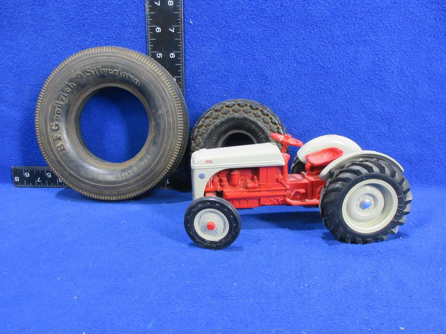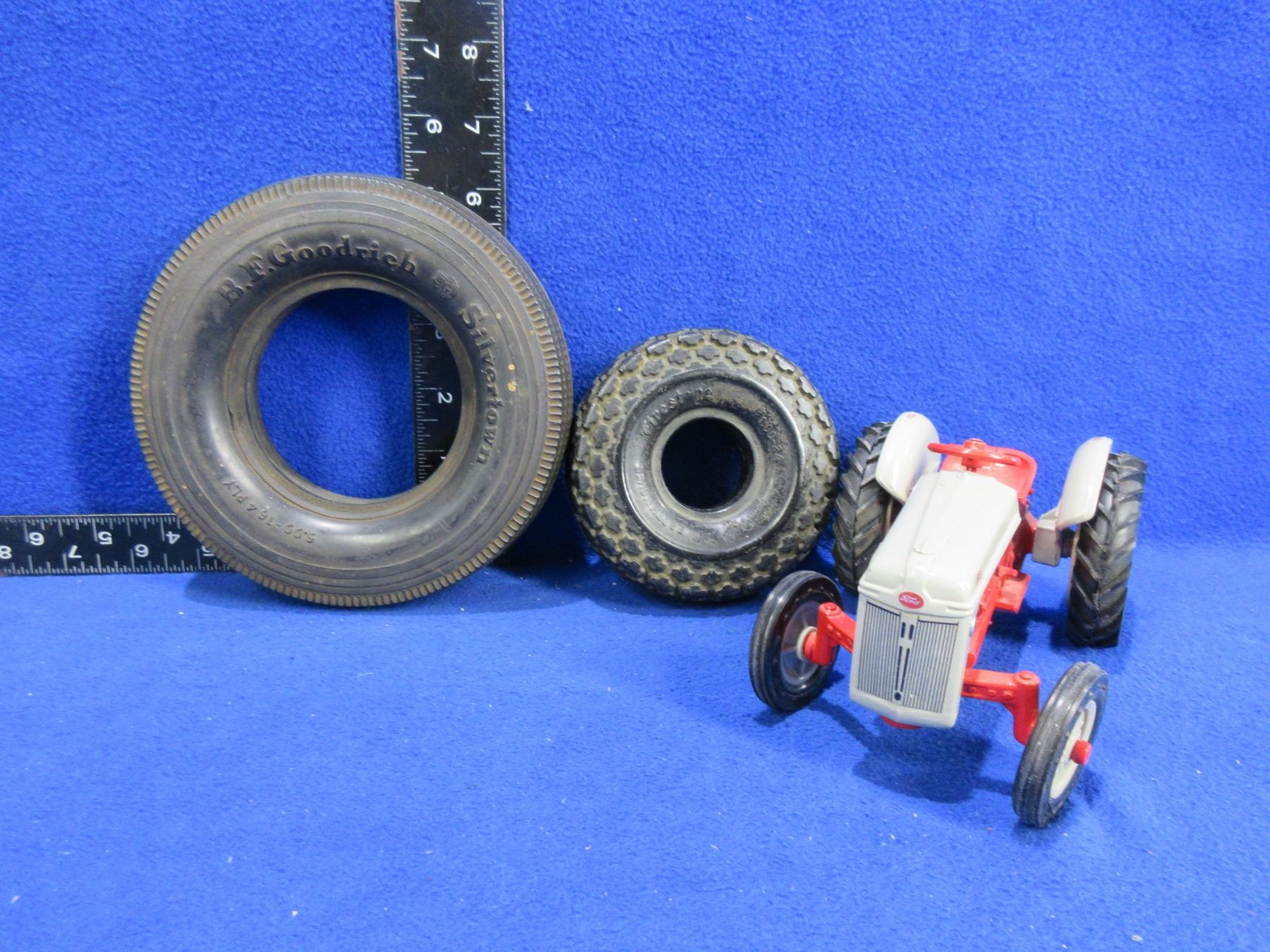 Vintage Rubber B.F. Goodrich (Glass Ashtray Missing) & Firestone (Earthmover) Salesman Sample, Vintage Ertl Ford Die Cast Toy Tractor (Tractor steering wheel does turn the front wheels)