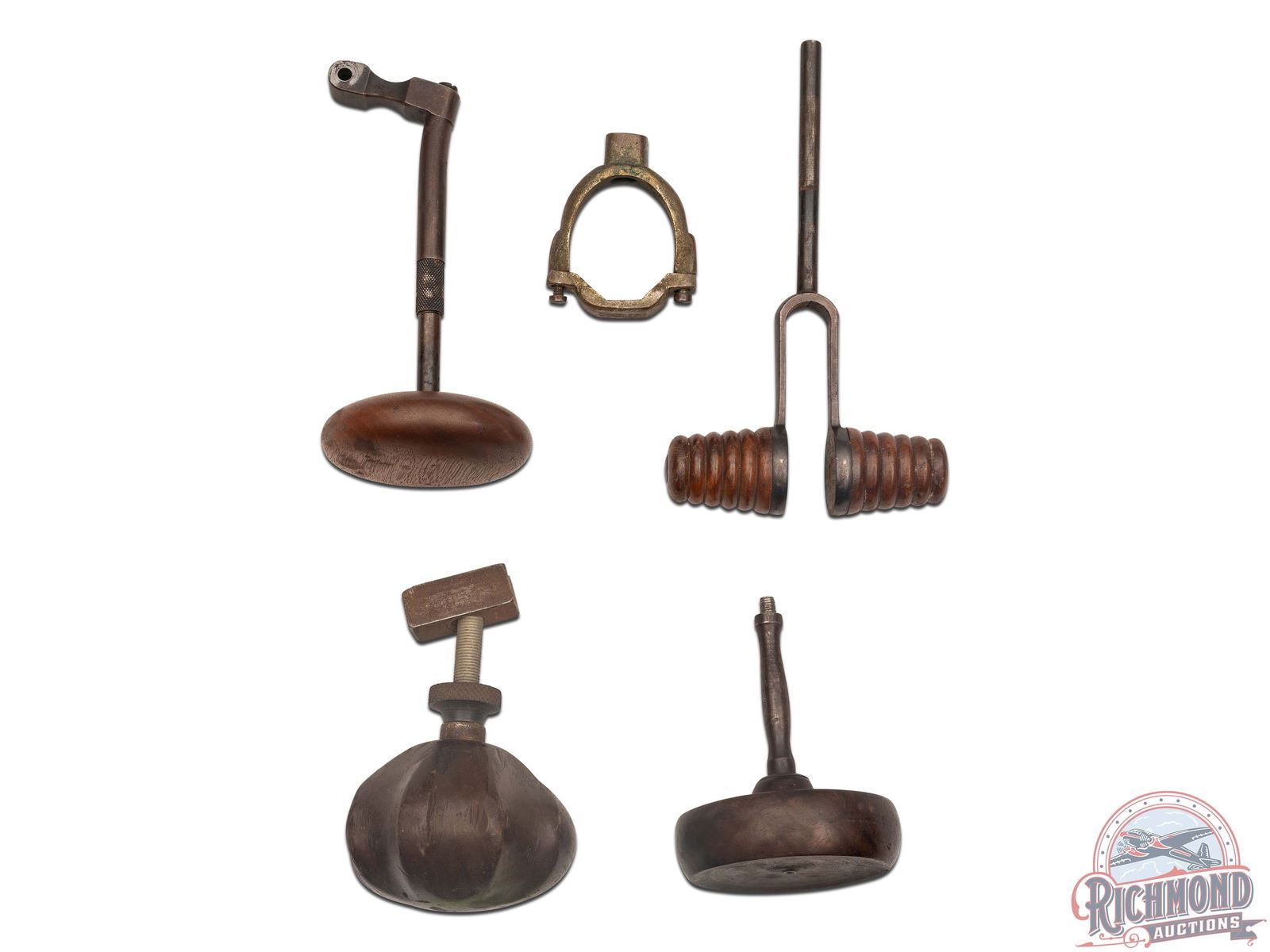 Lot consists of Zischang type flat knob rest with threaded stem, a tuning fork type rest with no mounts, a Pope-Stevens type round knob with adjustable stem, a Zettler of New York barrel mount clamp for a palm rest and a homemade finger groove wooden adjustable palm rest.