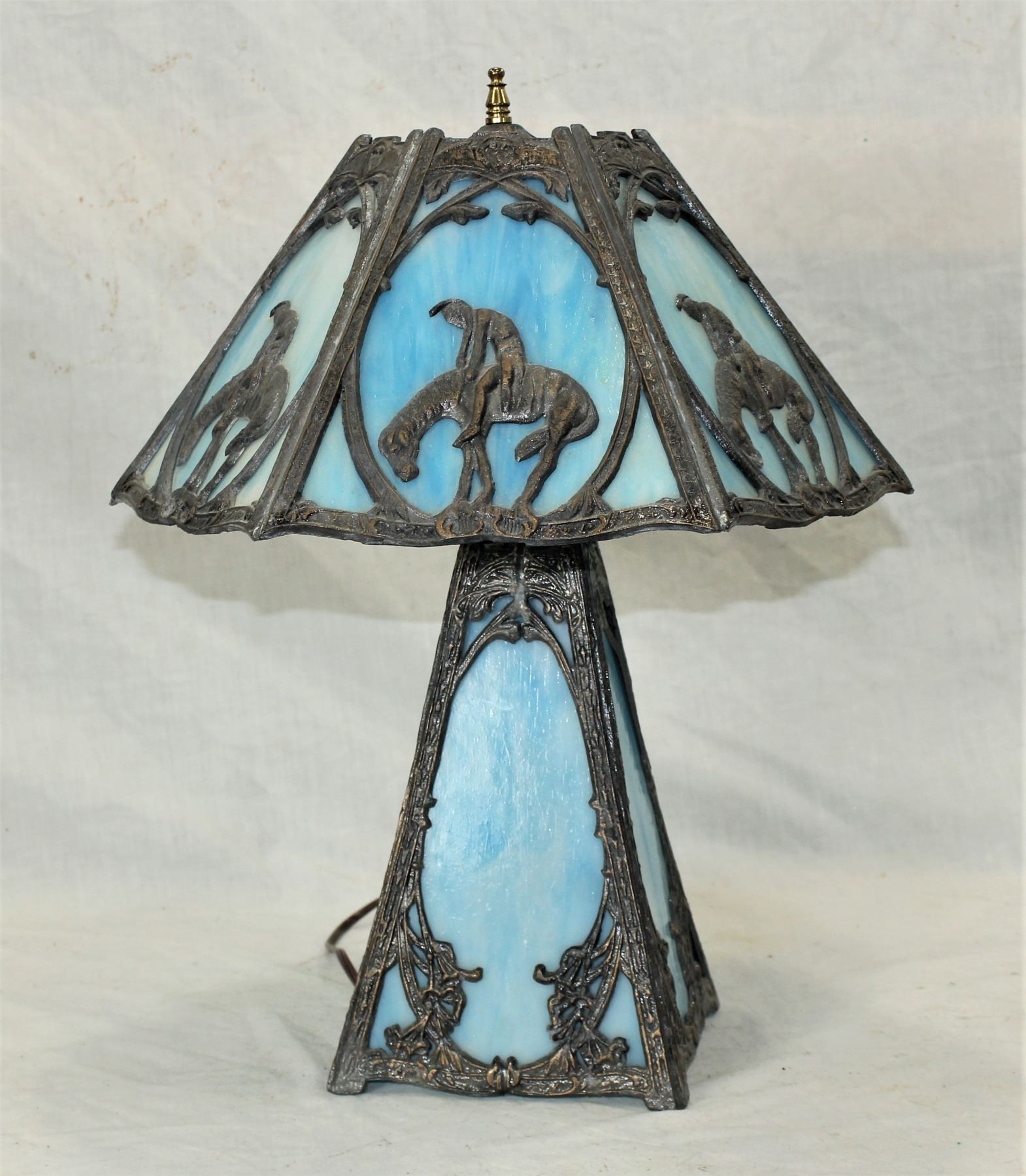 A showy blue slag glass table lamp with "End of the Trail" Native American scenes on each panel. Approximately 20" tall.