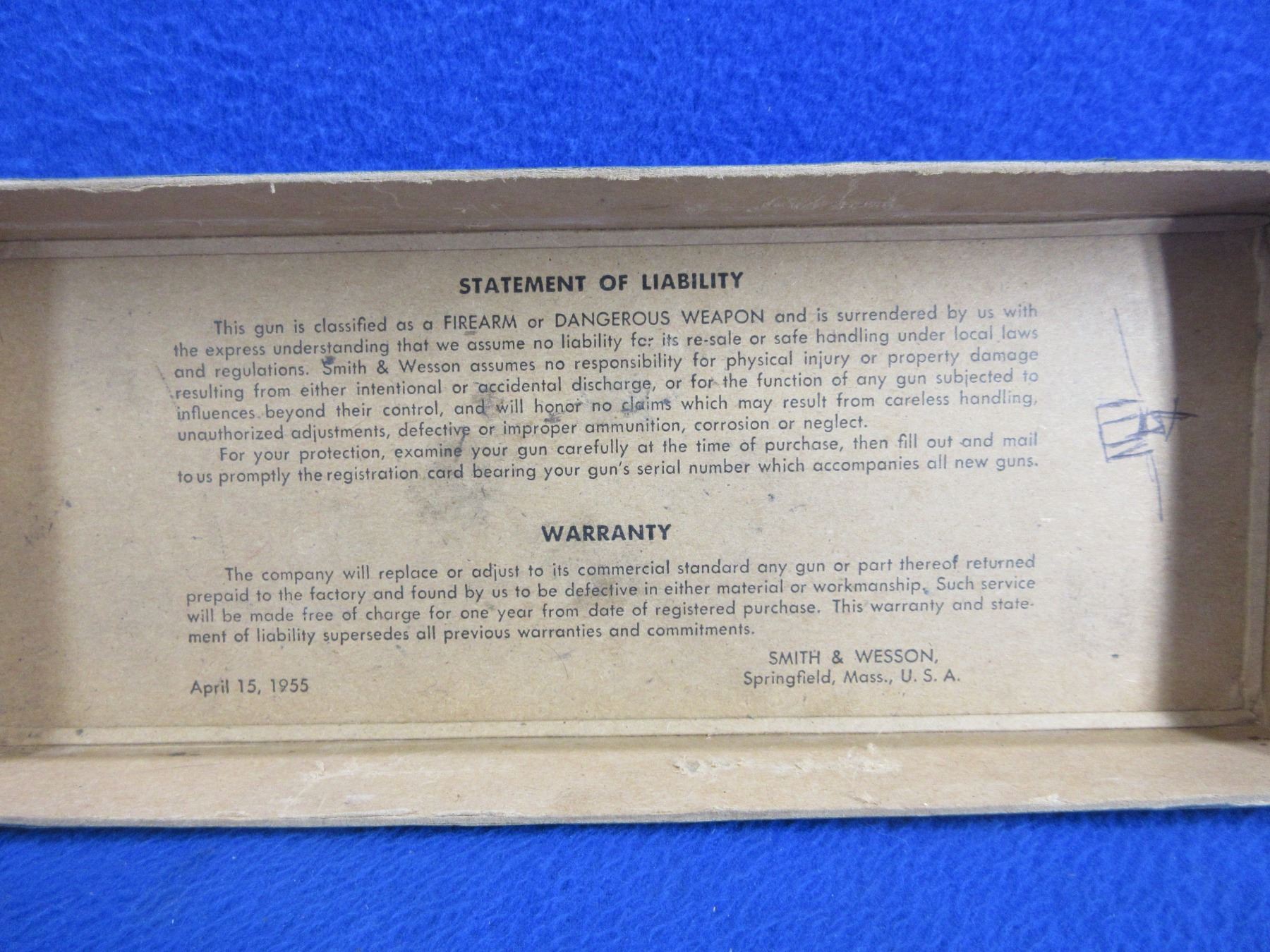 Vintage Smith & Wesson 6" Barreled Revolver Box - Marked April 15, 1955 - 11" x 4 1/2"