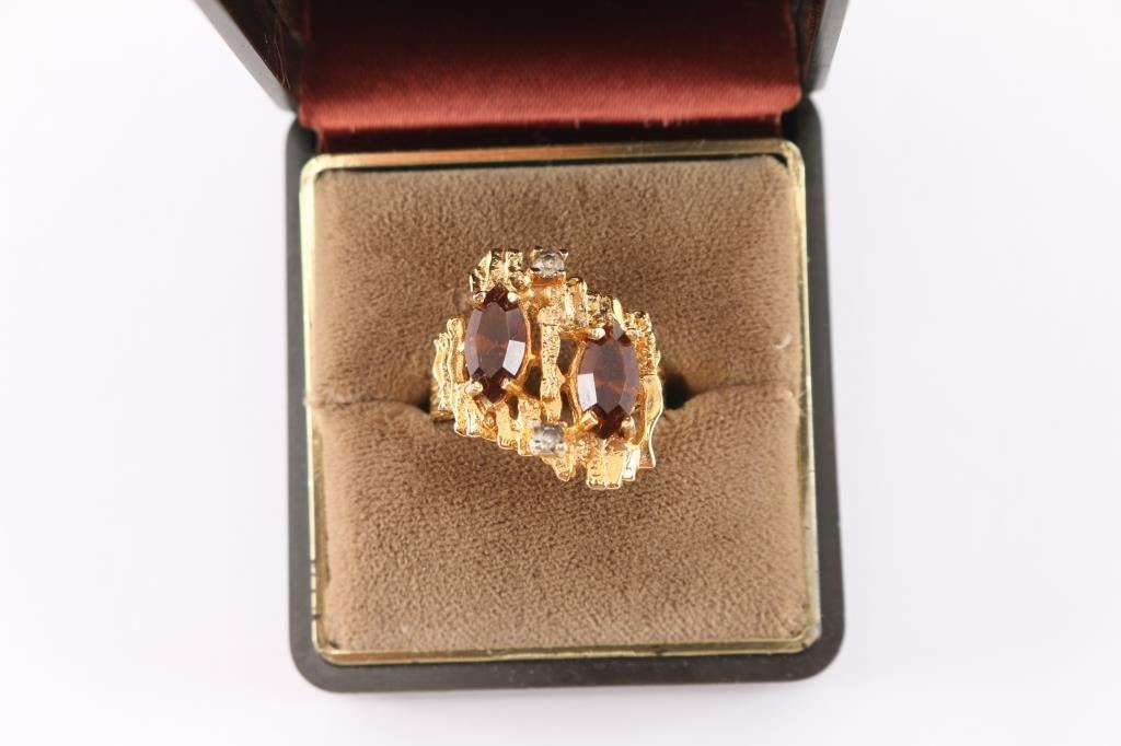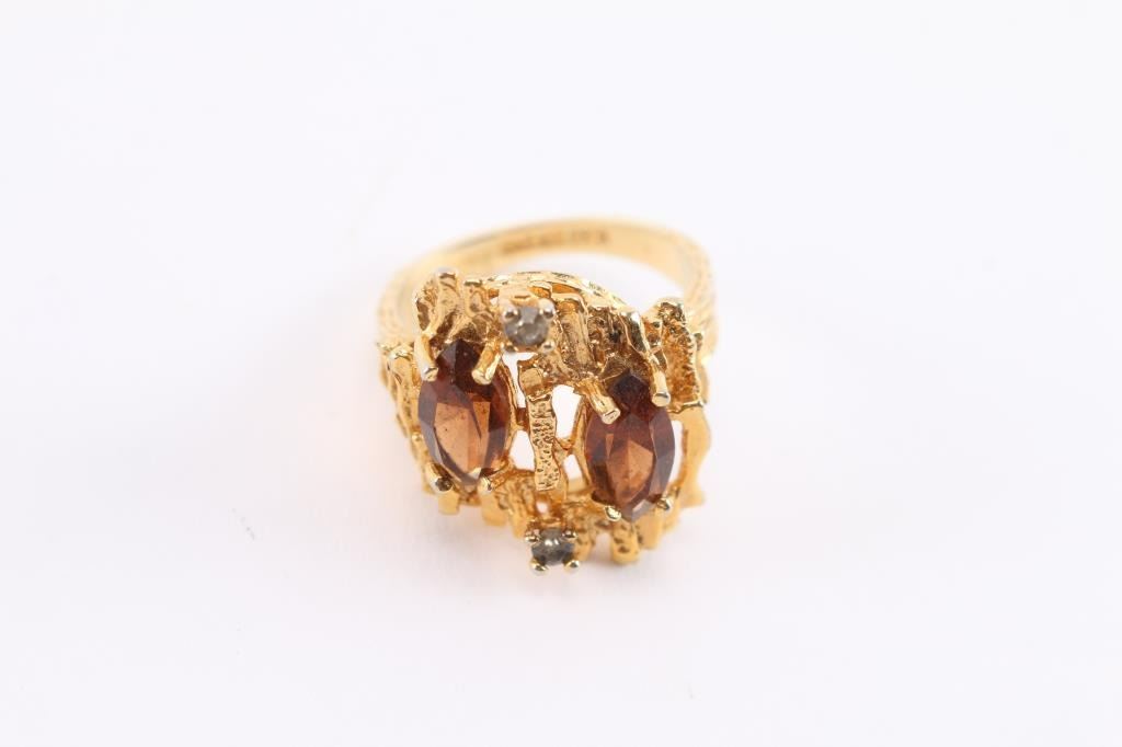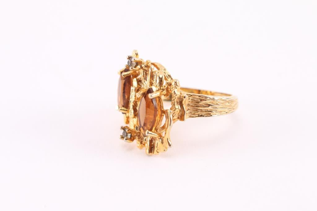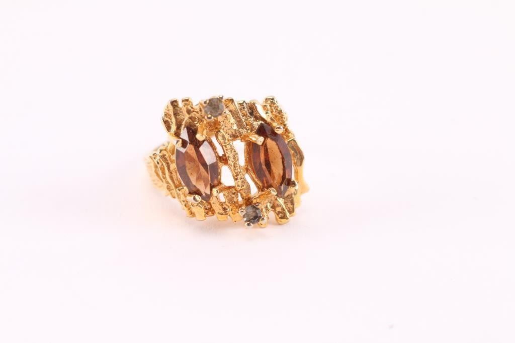 1960's-70's nugget style ring with two marquise cut topaz stones with two tiny diamonds set in 18kt yellow gold. Size 8