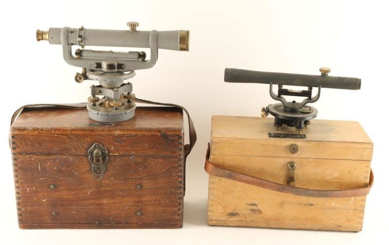 David White Level Mdl 110B in wood case and a Berger Surveyor in wood case with tripod. Both show use and wear.