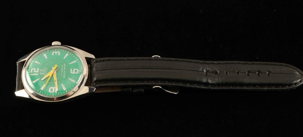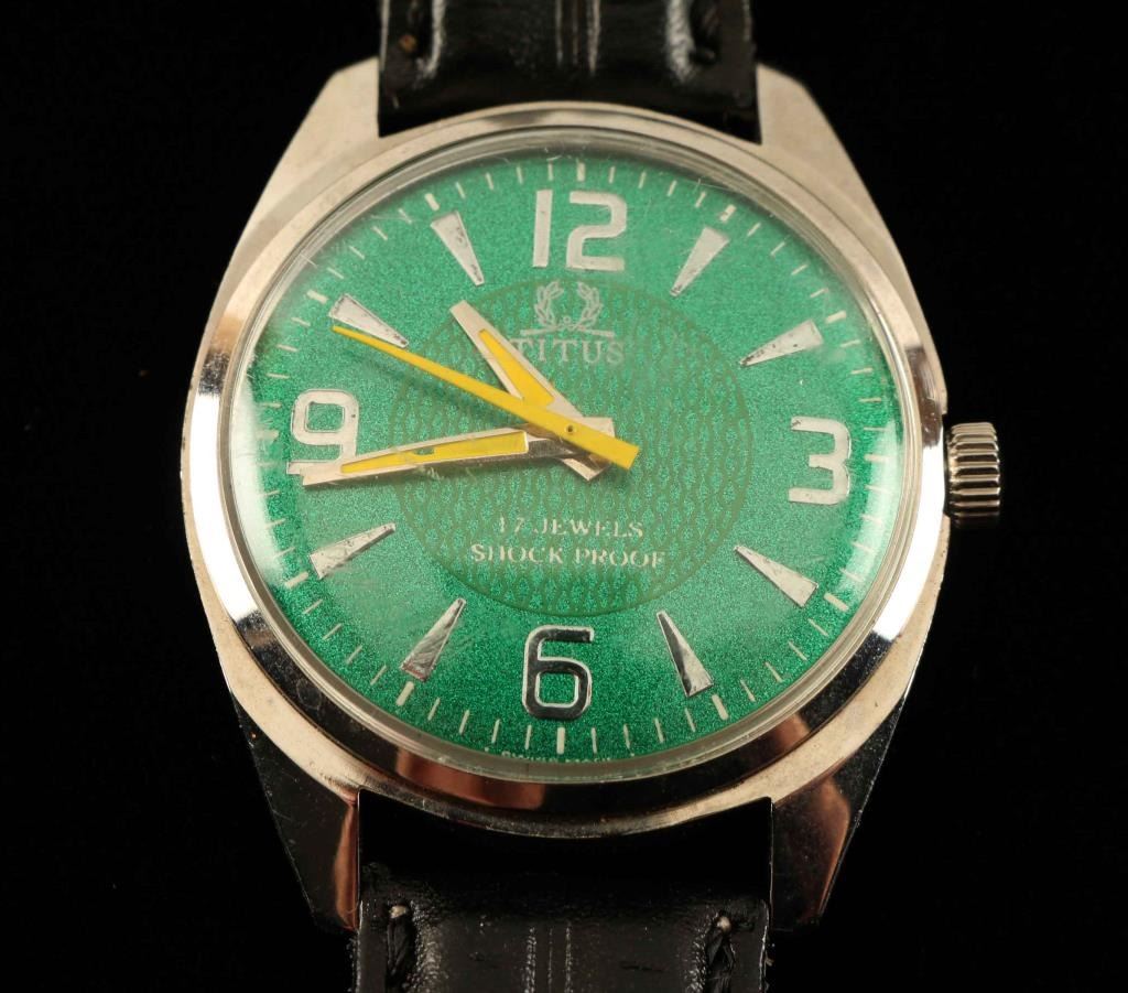 17 jewel, by Titus, with green metal flake dial, sweep second hand circa 1960's-70s, in working condition.