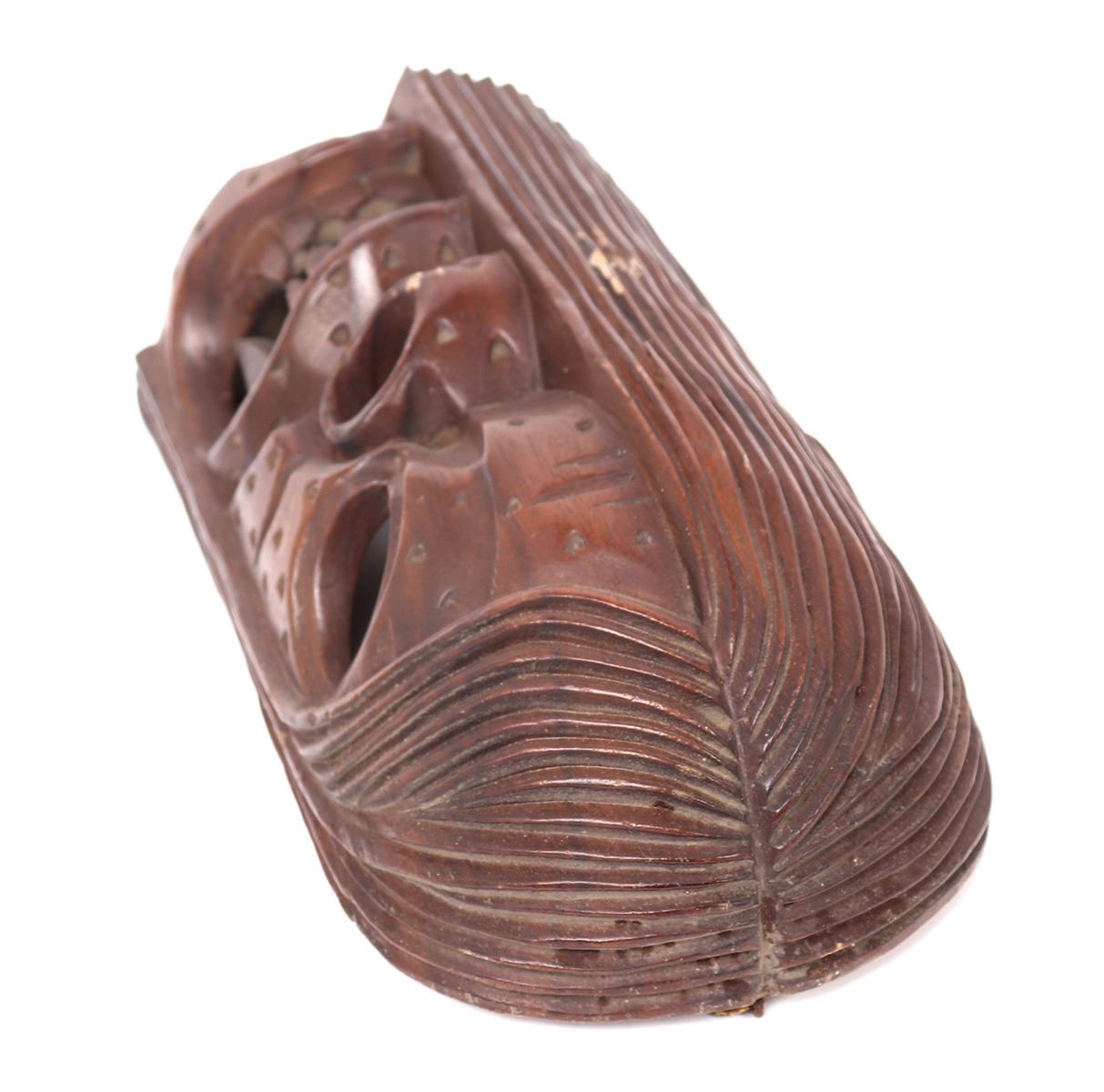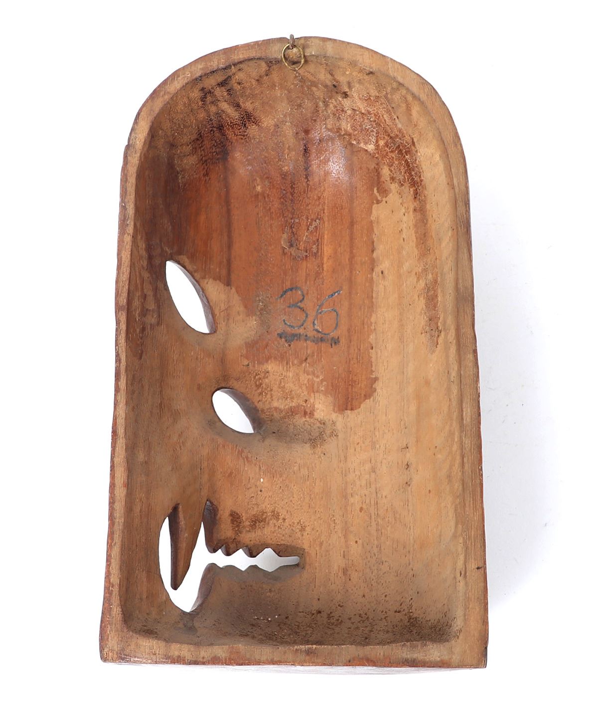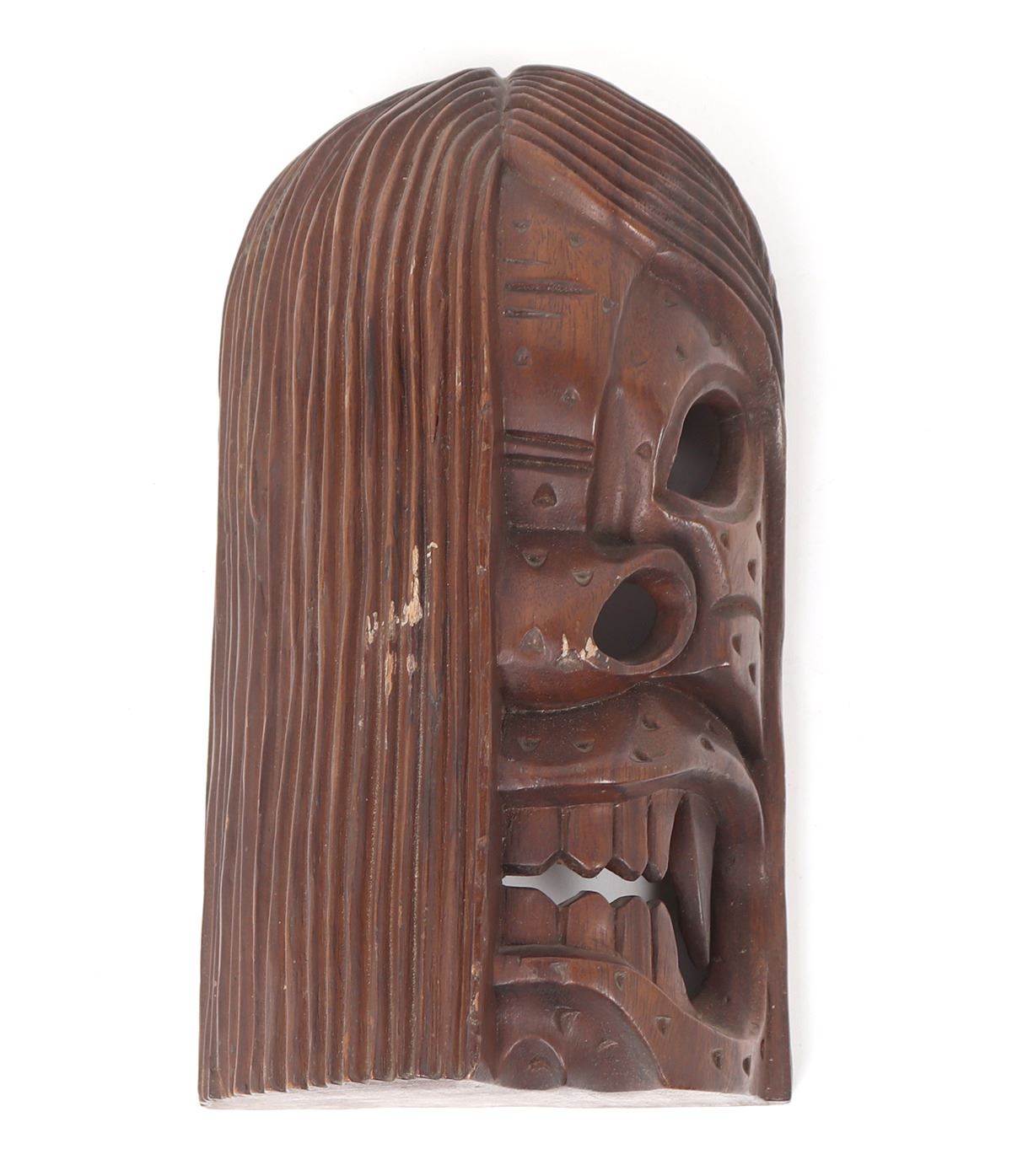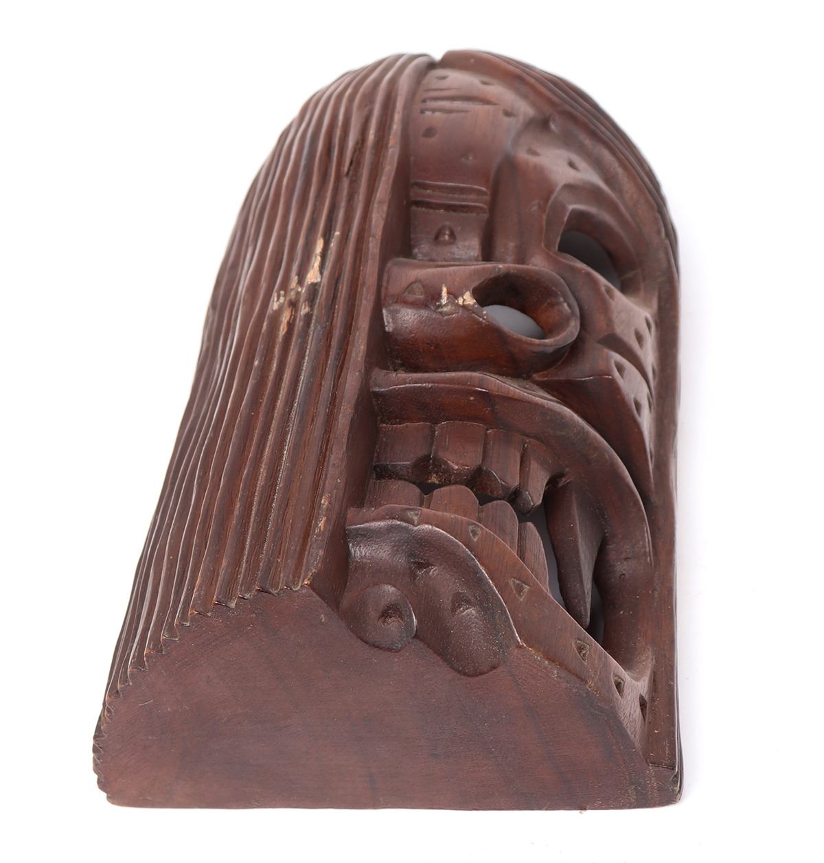 Handsomely carved tiki or tribal mask in a dark oak stained wood, with a half exposed face with large gaping teeth, flared nostrils and raised brows in a ferocious and intimidating expression. Numbered to the reverse #36, unknown artist. Size 12 1/4"L. Condition: Minor surface wear and scuffs.