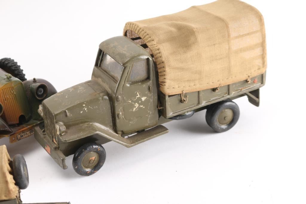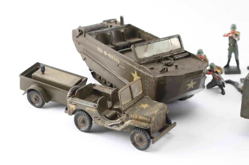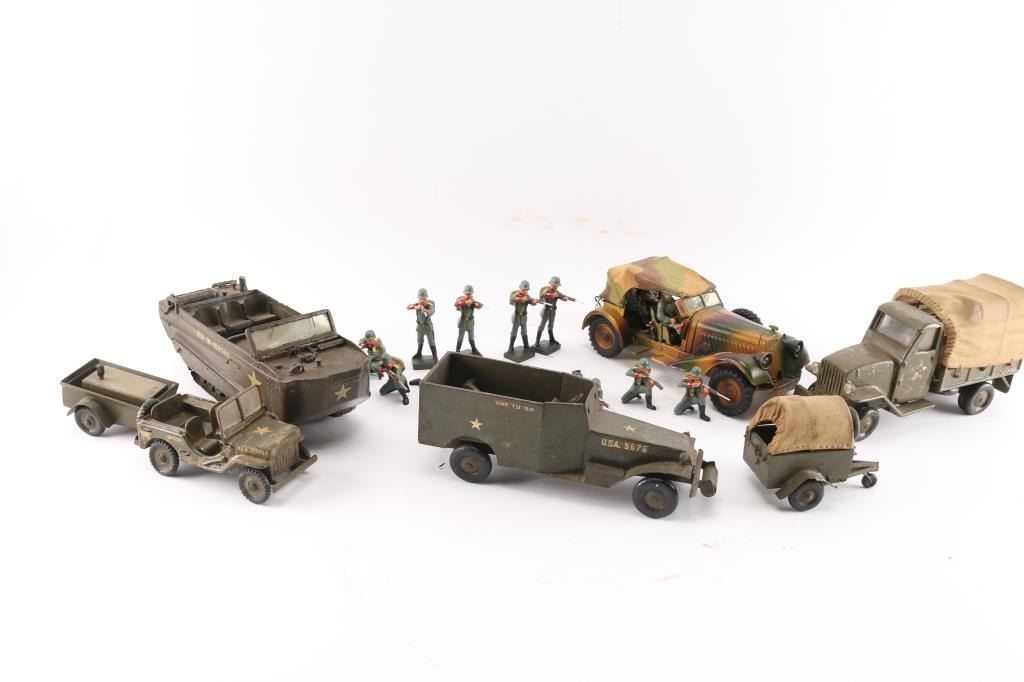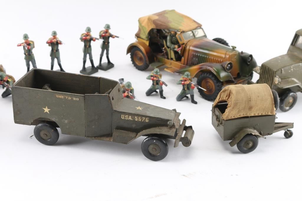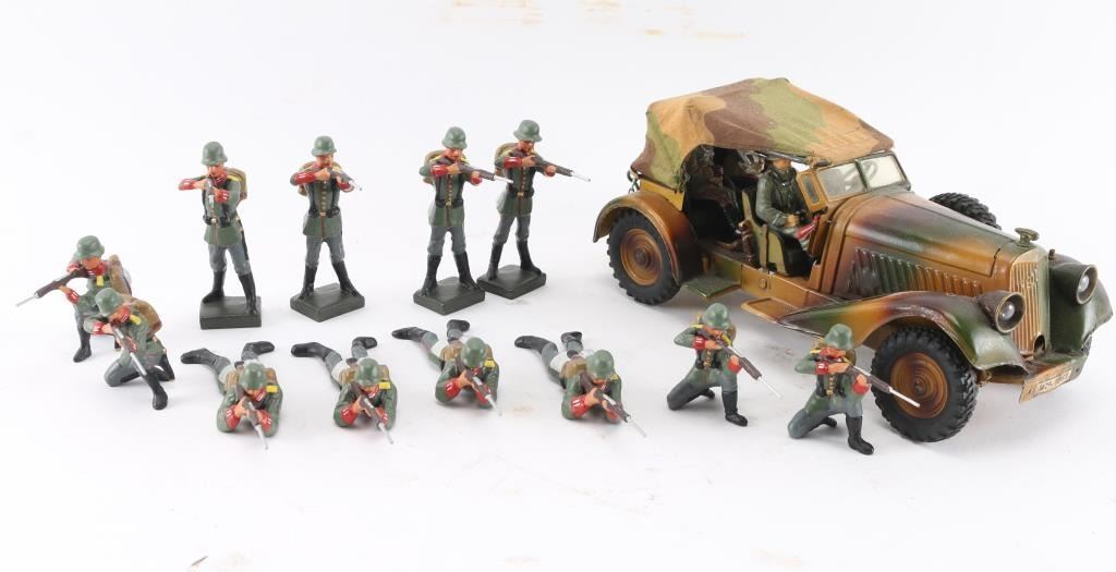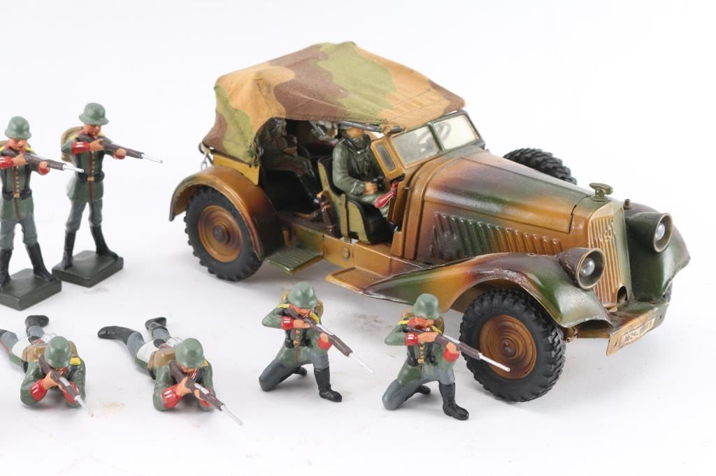 A nice collection, 50-80 years old. Handmade as labor of love by hobbyistVintage late 1930's very sharp-looking tin,Germany. High quality finely detailed all-metal tin plate model, featuring wind-up clockwork motor and battery-operated lights. It features 3-color camouflage paint, four hand-painted plastic soldiers, folding camouflage cloth top, missing both of its original flags from the fenders, has metal rifles in racks in the back seat. Features 6 rubber tires (two are mounted spares), marked “LINEOL”. Mechanism is untested, but everything appears to be present and functional (comes with key). Very good condition, showing minor wear to paint. Also comes with 12 vintage Lineol hand painted composition WW1 Imperial German soldiers. all firing rifles. 4 prone, 4 standing, & 4 kneeling. All very good condition. No damage.