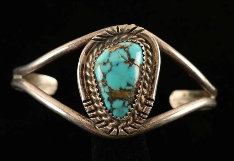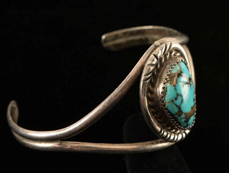 Center triangle cab of turquoise with a lovely brown matrix is surrounded by a silver rope motif. Two open strands of silver join at each end of bracelet. Hallmarked by artist, inside measures 2 3/8".
