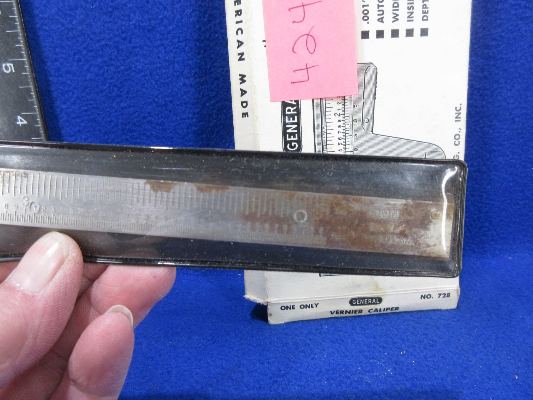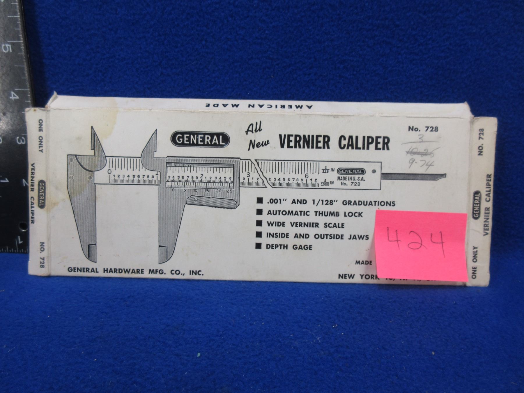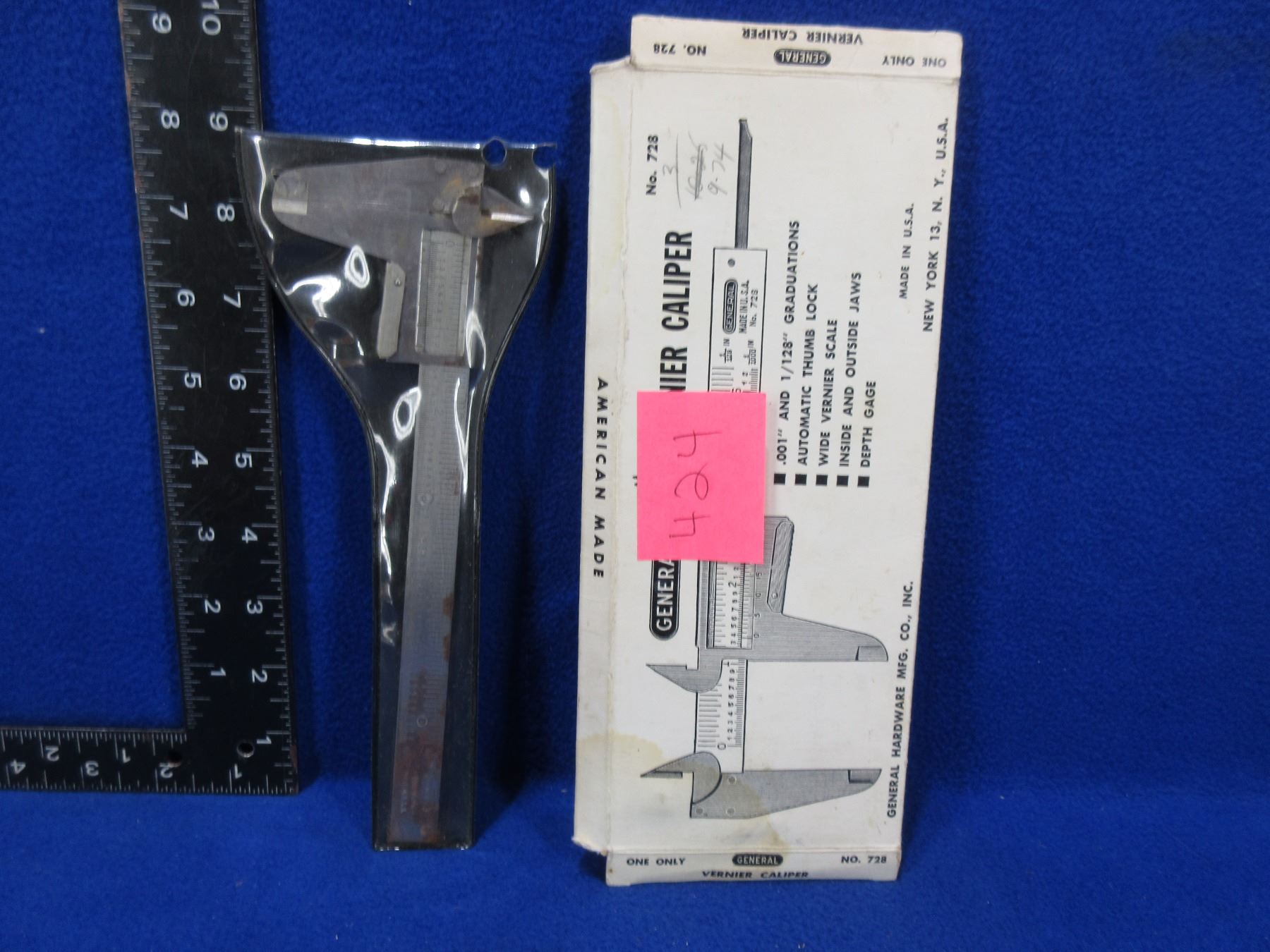 Vintage Vernier Caliper No. 728 - General Hardware Mfg. Co. - Calipers are rusted and box is flattened