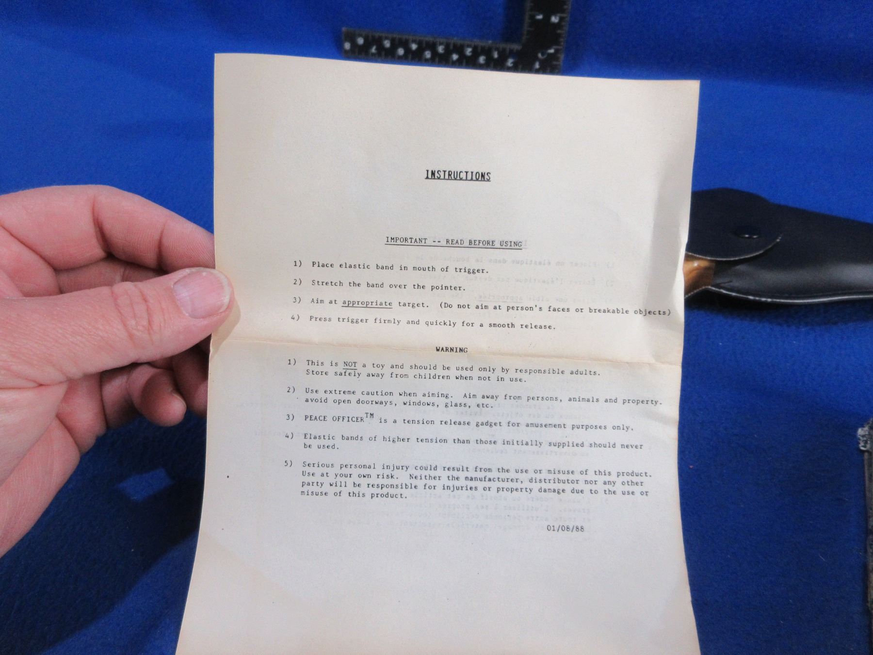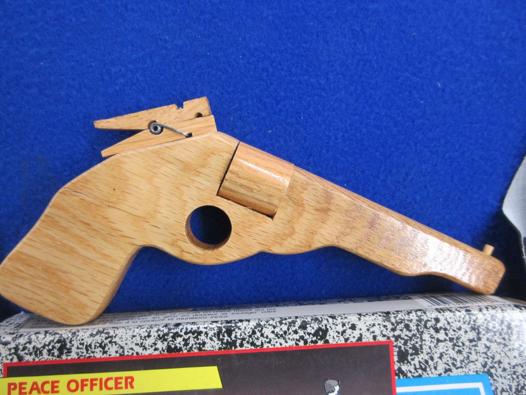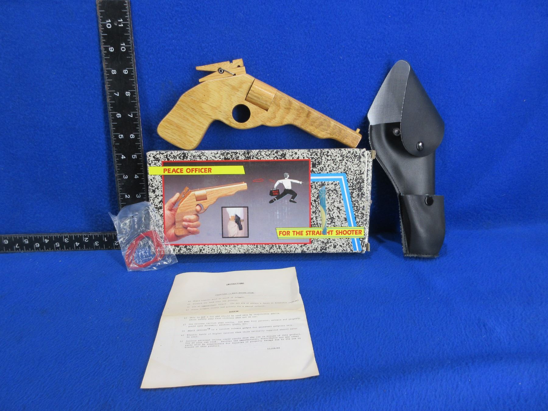 Vintage Wood Toy Elastic Shooter with Holster and Original Box - Peace Officer - For The Straight Shooter - Comes with 4 Elastics and Instructions