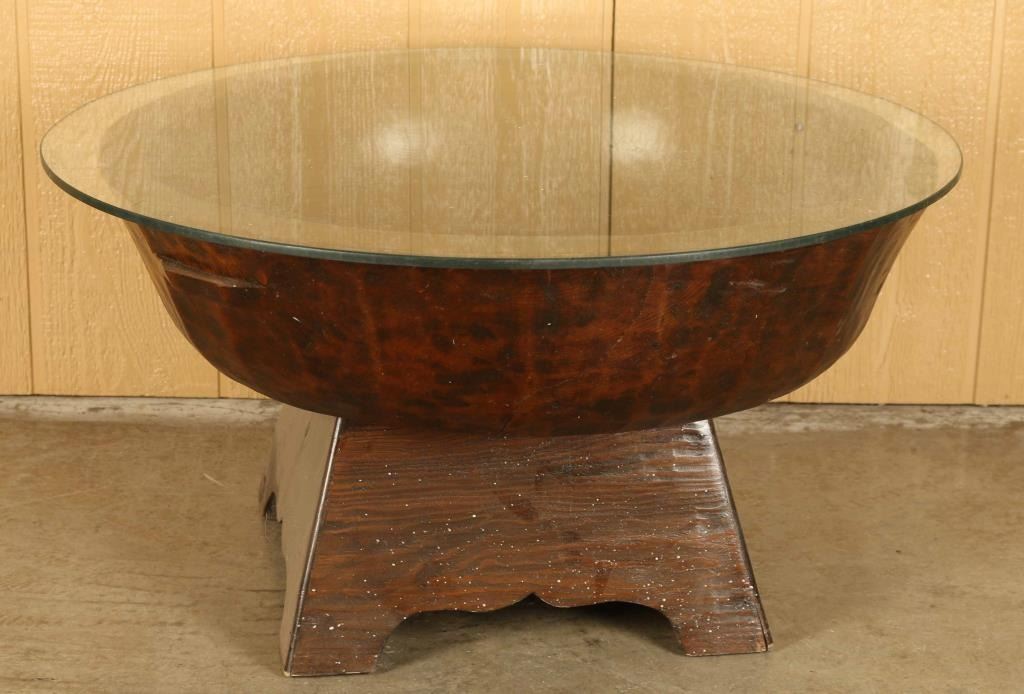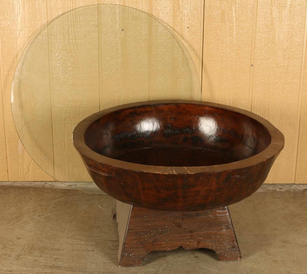 All carved single piece of wood with glass top. Would be great to use as a shadow box display. Measures 30.5" diameter x 16" tall.