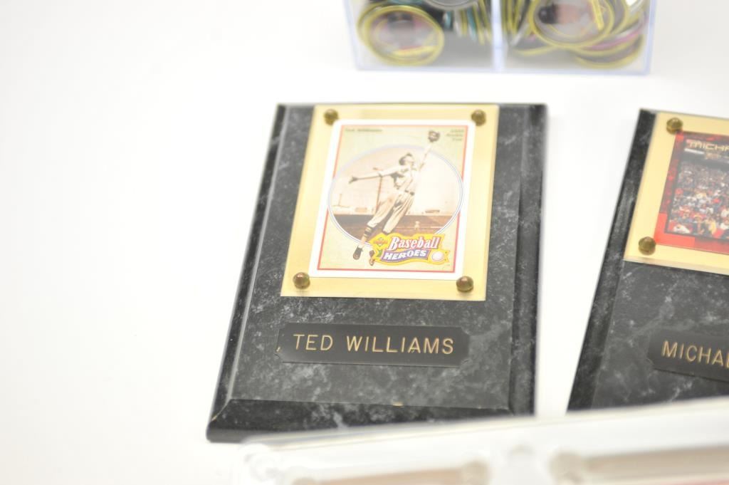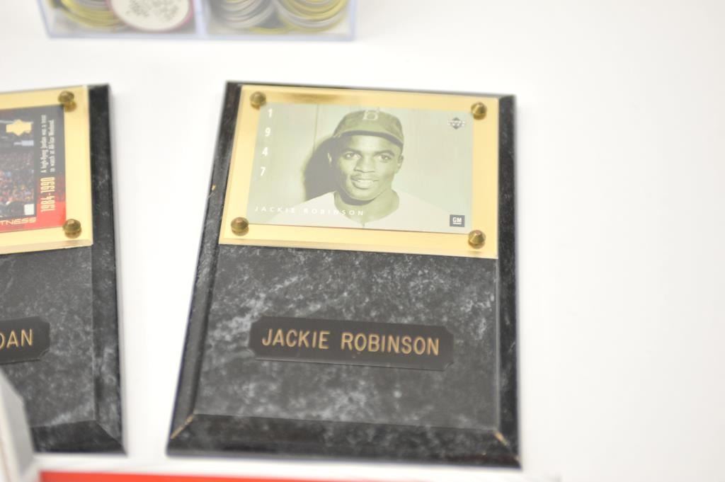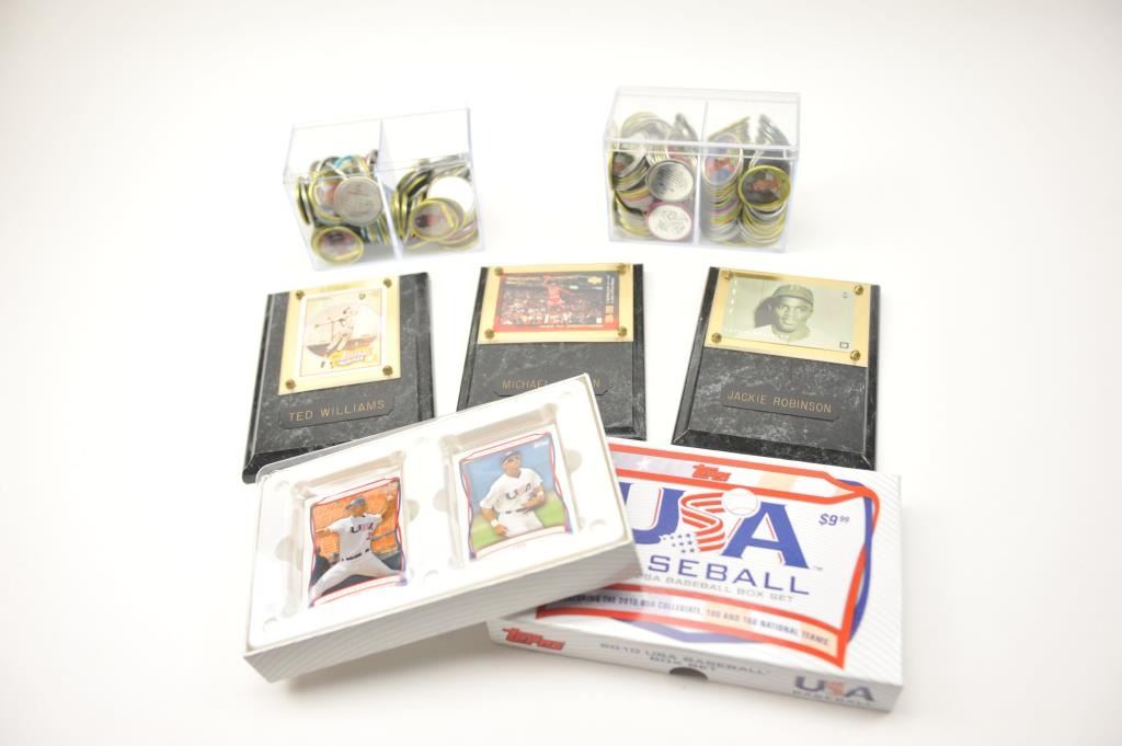 Vintage lot of 1990 issued Topps “Milk Bottle Caps” MLB collectable trading caps, Topps 2010 USA Baseball limited edition set of cards for the National amateur and collegiate stars. Additionally, the lot includes three 7” x 5” wall plaques with Jackie Robinson, Michael Jordan and Ted Williams cards. A great decorator set for the sports enthusiast. Est.: $125-$250.