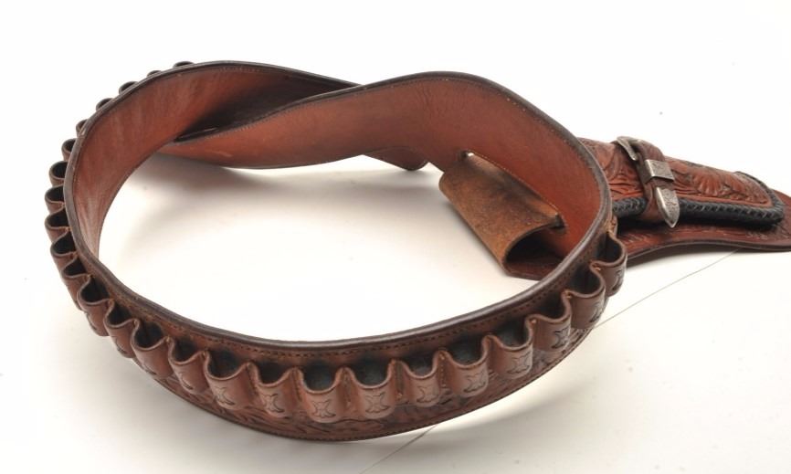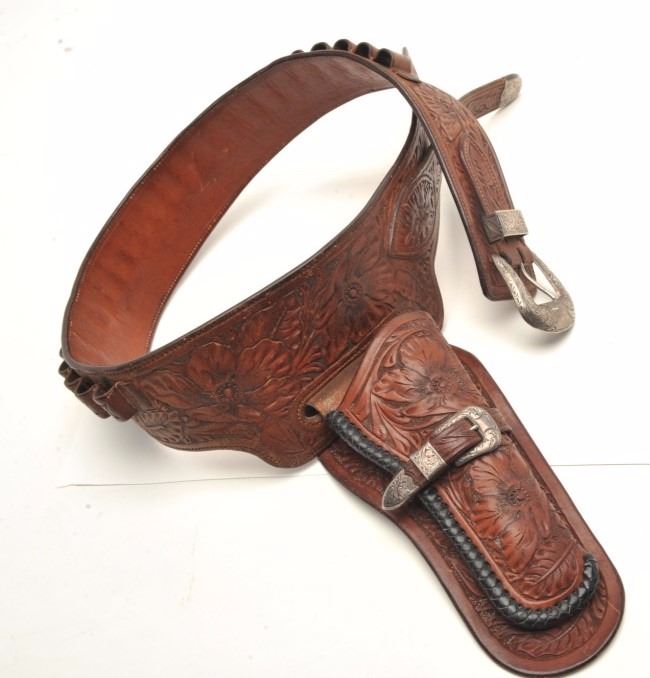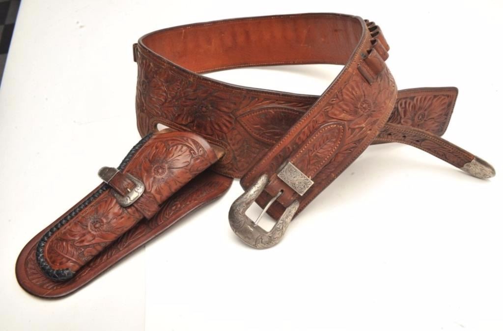 pattern with silver buckles and keepers for 4 ¾” or 5 ½” single action. 44-45 caliber loops on the belt which is a large size 38-40 waist. 1930-40s buscadero rig. Est.: $1750-$3500