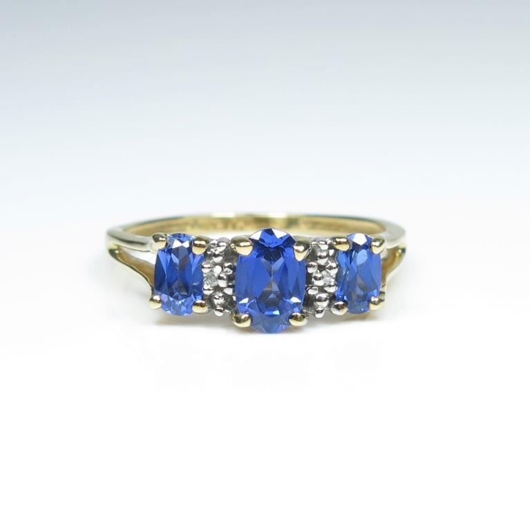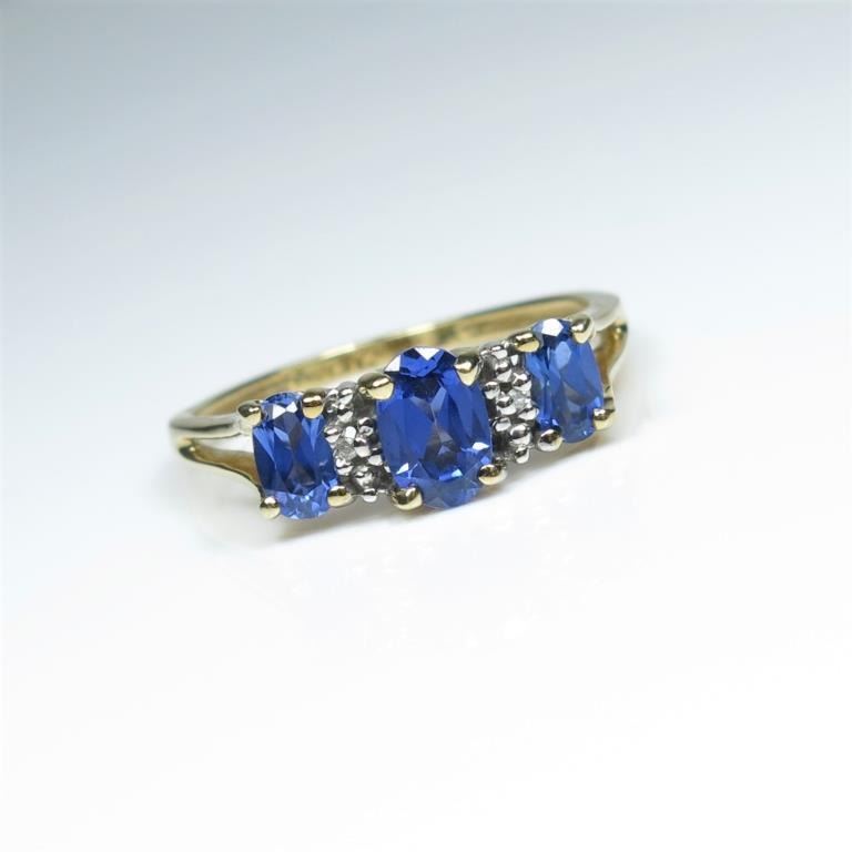 featuring 3 oval cut Tanzanites weighing approx. 1.00 carat total with Diamond accents set in 10 karat yellow gold setting.