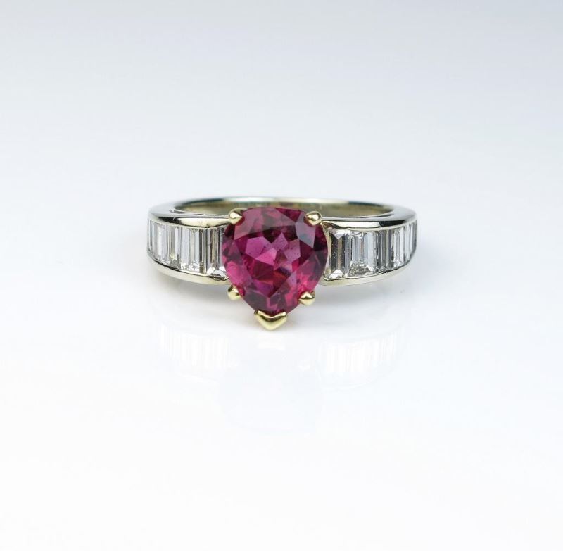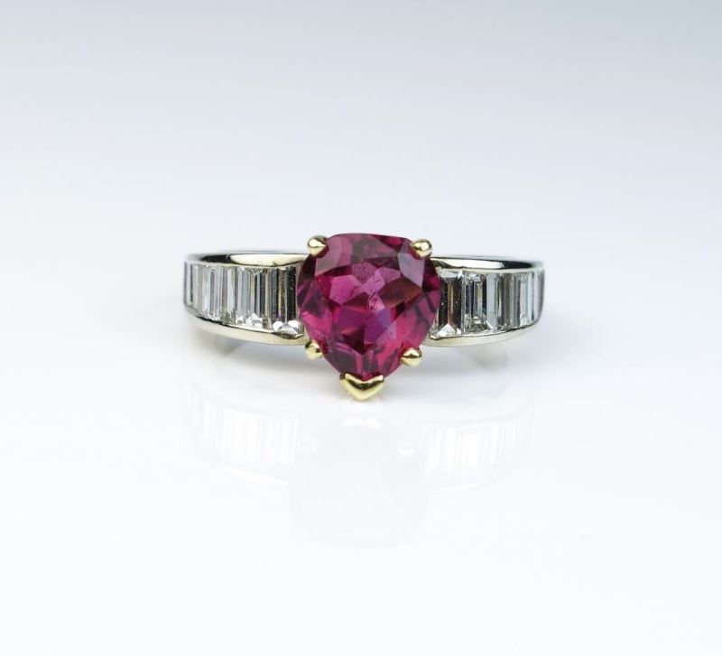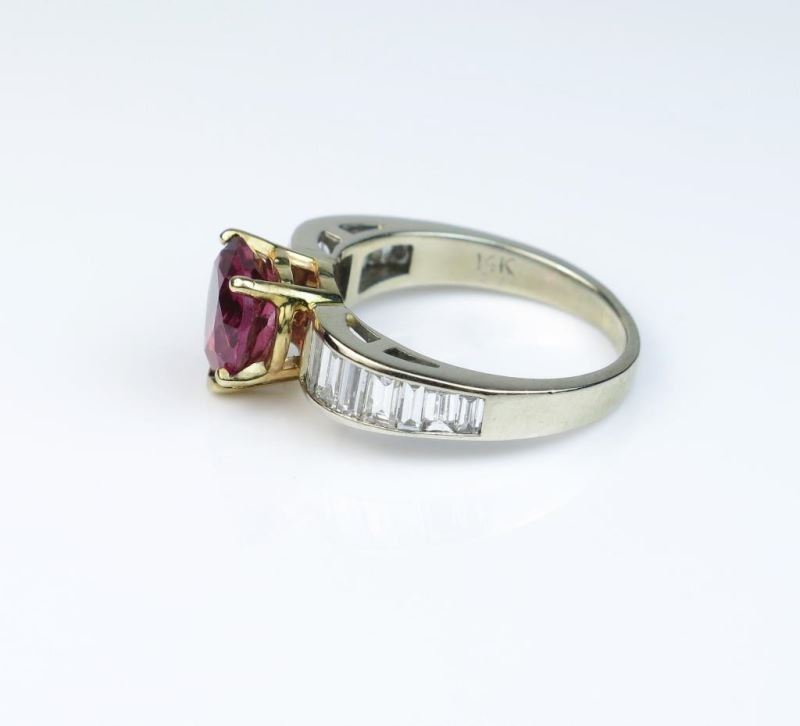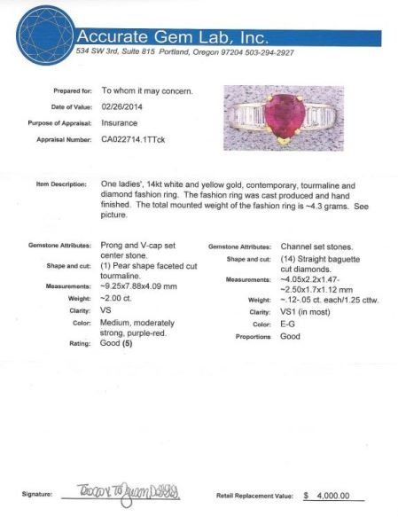 Gorgeous ring with tourmaline weighing approx. 2.00 carats channel set with 14 baguette cut diamonds weighing approx. 1.25 carats of E-G colors and VS clarity set in 14 karat white and yellow gold setting. Comes with a full appraisal.