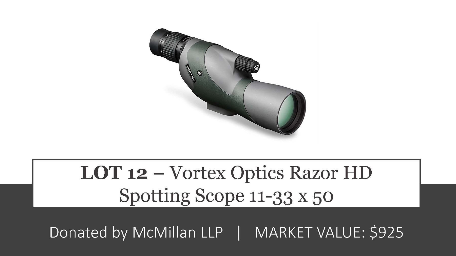 Donated by McMillan LLP Setting the standard in high-end optical technologies, precision craftsmanship and ultra-sleek functionality, the Razor HD is one of the finest spotting scopes on the market. Advanced optical elements eliminate aberrations for distortion-free, flat field images with unmatched edge-to-edge sharpness, as well as remarkable clarity, resolution and color accuracy.