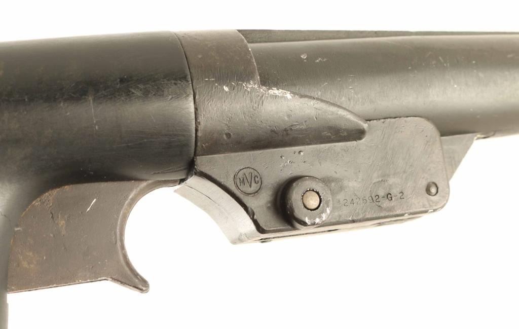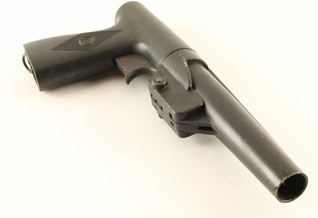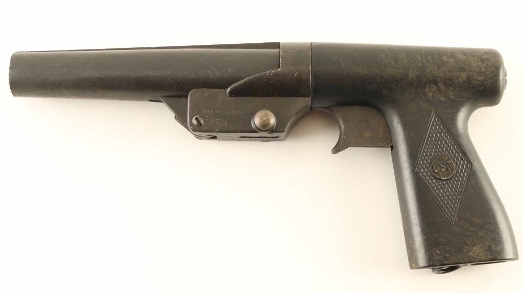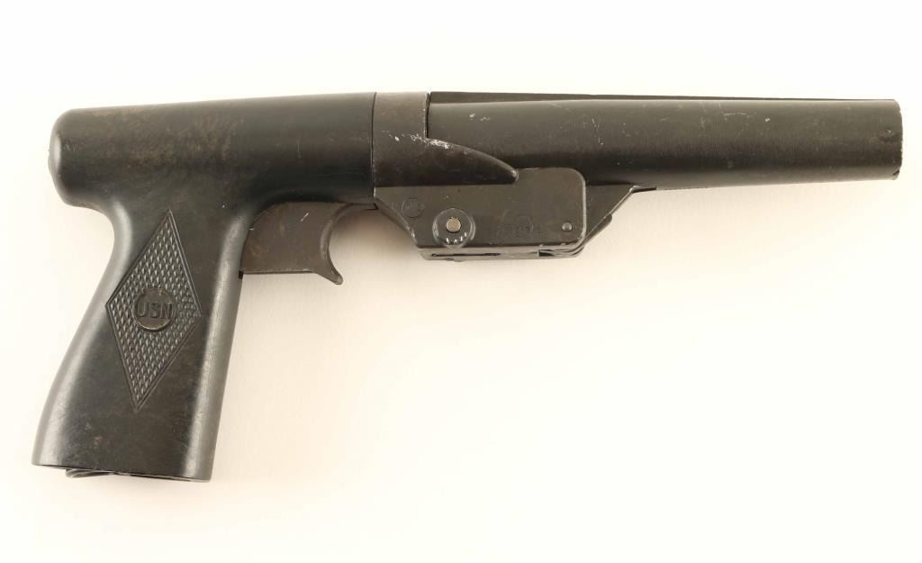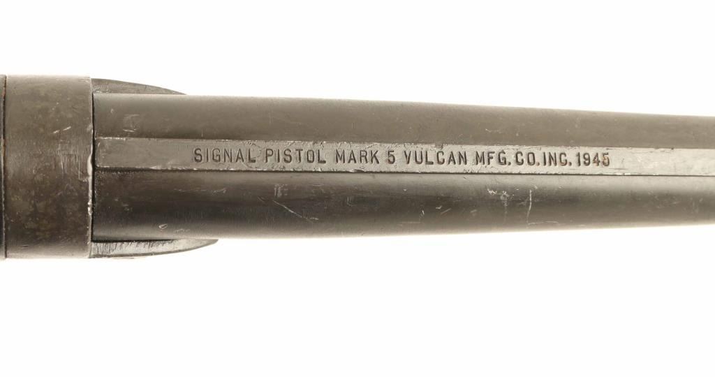 USN marked flare launcher features 6" barrel, double action only trigger, internal hammer, button latch to break open, lanyard ring at butt. Bore is very good condition with some roughness. Metal surfaces retain 80% dark gray or black colored finish, with scuffs, scratches and rub spots revealing bright silver colored metal underneath. One piece grip is black plastic, good condition. Markings include "VMC" inside circle & "242692-G-2" on right side, "SIGNAL PISTOL MARK 5 VULCAN MFG CO INC. 1945" on barrel. Importer mark on left side "CAI ST ALB VT" over "471" stamping. Overall condition is Good.