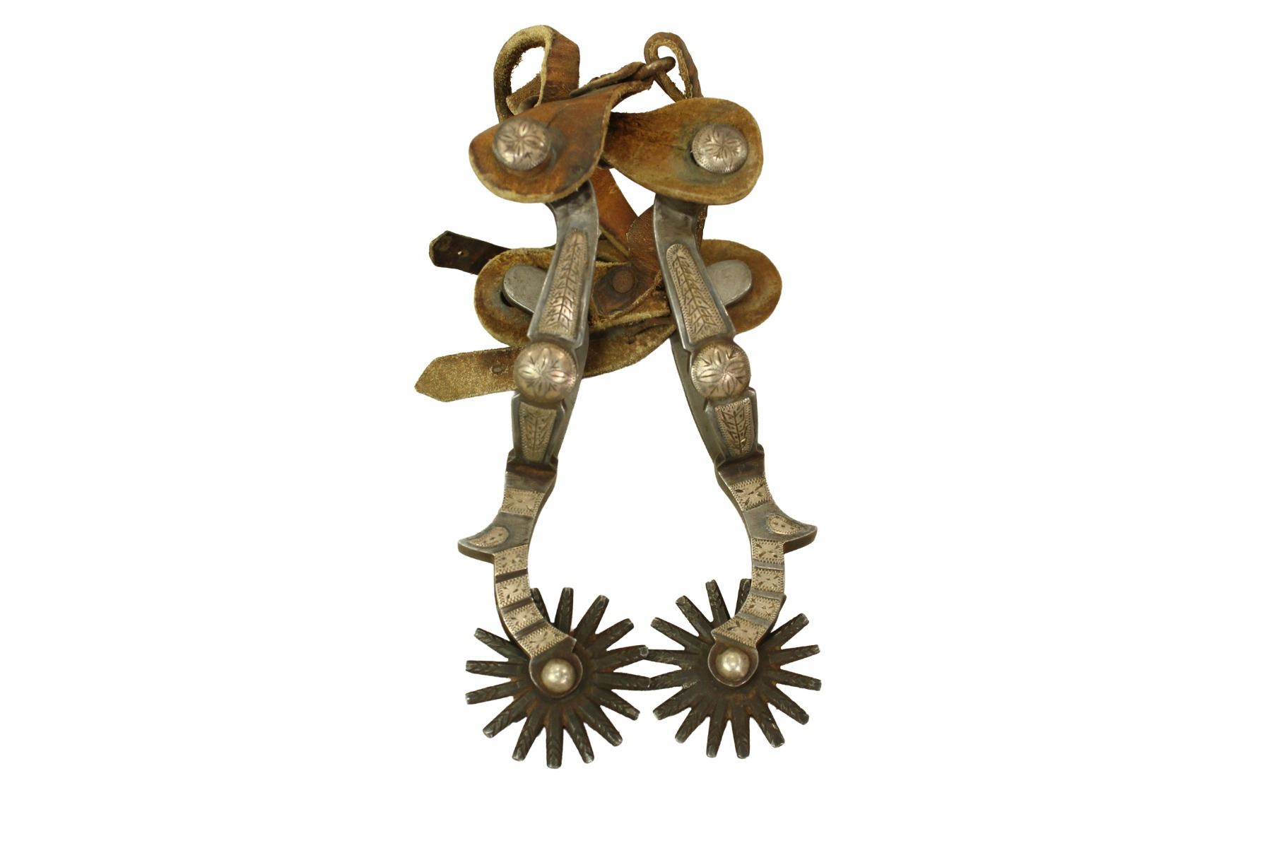 Decorative California style spurs, single inlaid with stylish silver and topped off with large multi-point rowels.