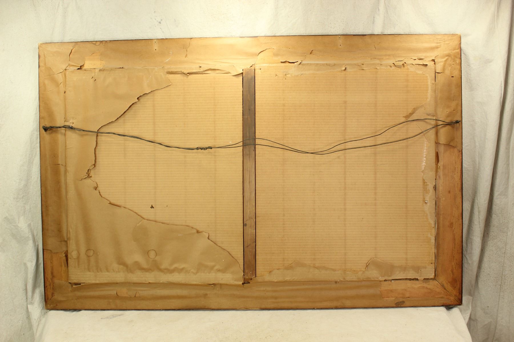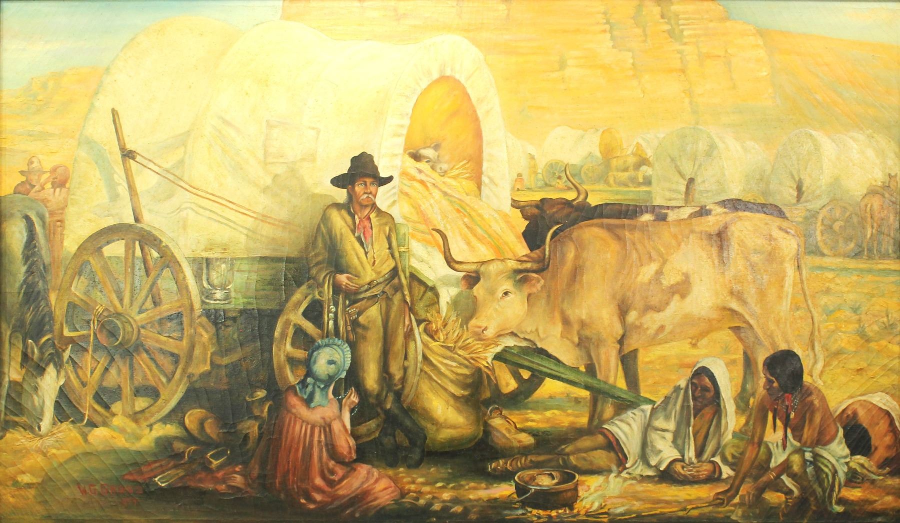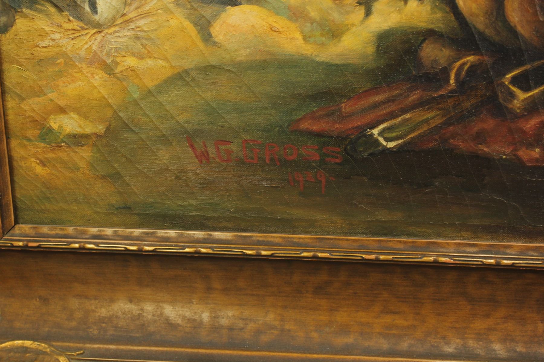 Facinating oil on canvas with striking western scene, done by artist W.G. Gross, signed in lower right. Beautifully framed and measuring 36"x 56" and 28"x 48" sight.