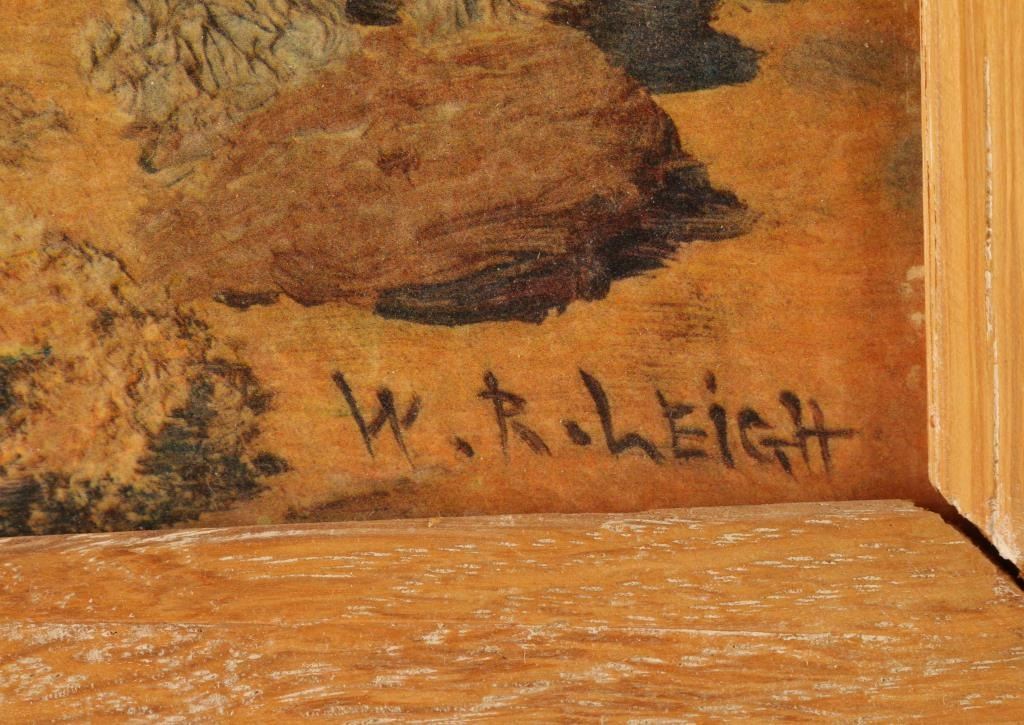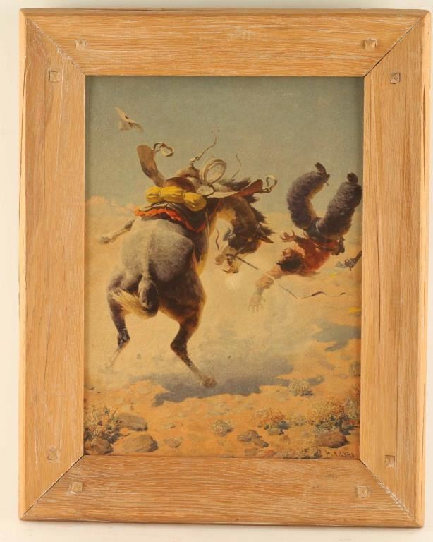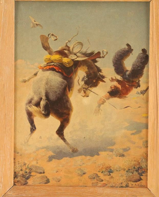 Includes a print of the painting "Greased Lightning" by W. R. Leigh. The art work depicts a man being bucked off of a horse. This piece is framed with an image size of 11" by 15".