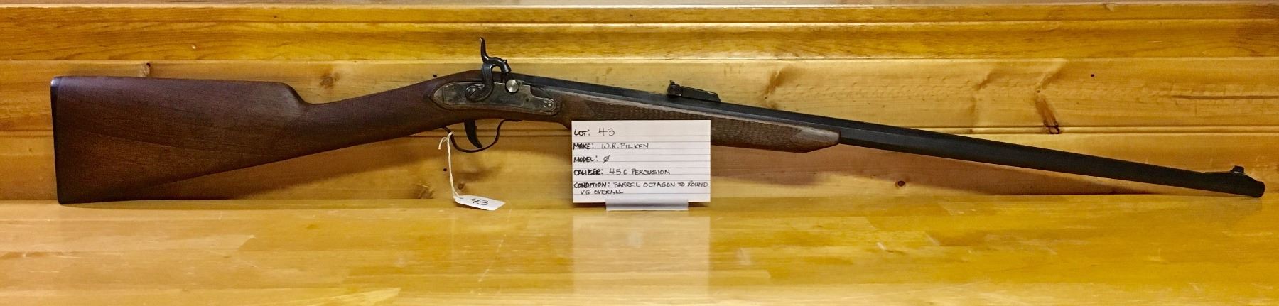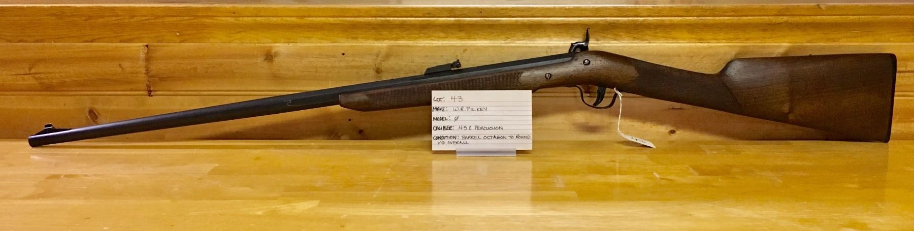 LOT: 43 MAKE: W.R. PILKEY MODEL: NONE CALIBER: .45 C PERCUSSION CONDITION: VG, BARREL OCTAGON TO ROUND S/N: NONE