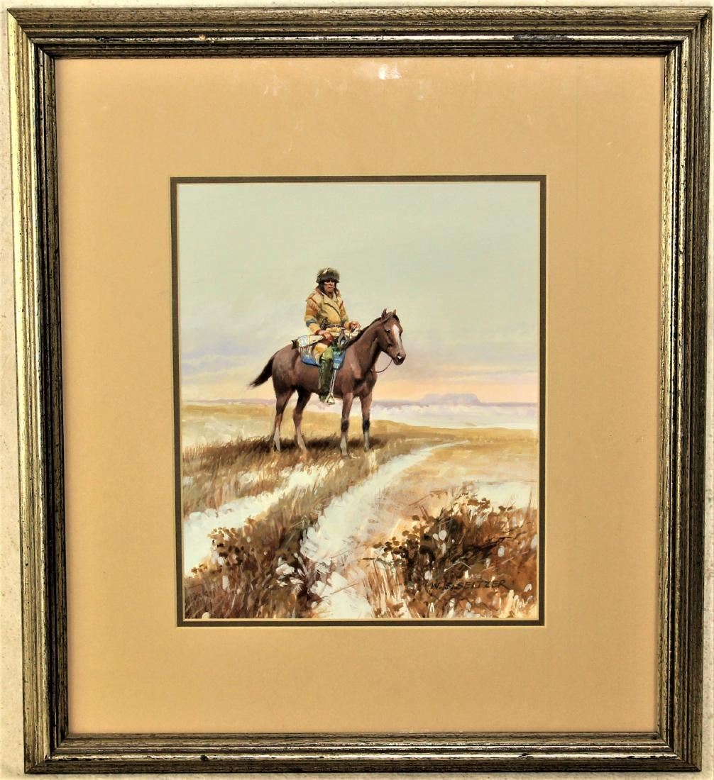 Framed and matted work by W. S. Seltzer of Montana depicting an American Indian on horseback in the winter acting as a “Sentinel; beautiful colors and detail; approximately 19 x 17 overall.