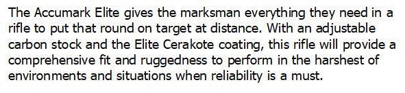 The tried and true Accumark just became even more versatile. The Accumark Elite gives the marksman everything they need in a rifle to put that round on target at distance. With an adjustable carbon stock and the Elite Cerakote coating, this rifle will provide a comprehensive fit and ruggedness to perform in the harshest of environments and situations when reliability is a must.