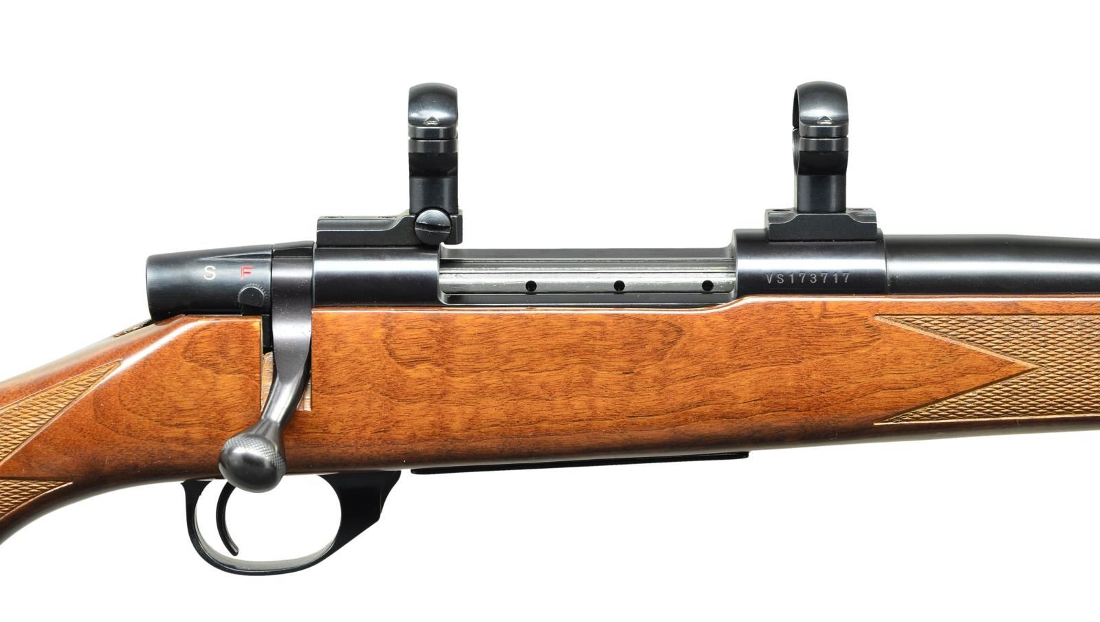 Cal. 257 Wby. Mag. S# VS173717. Bbl. 24" w/ out provision for sights. Mfg. 1984-2010 as Series 1 by Howa of Japan. Has all features of Deluxe model except no grip cap; all gloss finished checkered walnut Monte Carlo stock w/ rosewood forend tip, sling studs, hinged floorplate & Decelerator style solid black recoil pad w/ Weatherby markings. Certain Vanguards (including those w/ in VS serial number range) were subject to factory safety recall; this rifle was not affected. Leupold 2 piece base & high 1" ring set. Safety is 3 position type on right side by shroud. Caliber known to be one of Weatherby's most accurate. CONDITION: occasional faint stock marks; all other aspects including bore are near excellent. (23-318/NW). MODERN. $450-650.