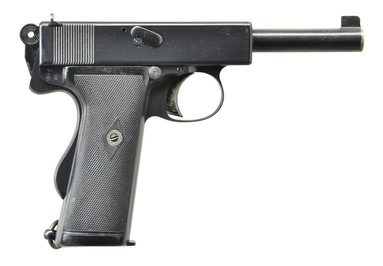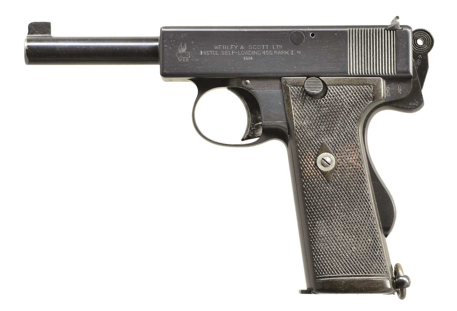 PISTOL. Cal. 455 Webley Auto. S# 6451. Bbl. 5" w/ square faced blade sight plus windage adj. rear. Mfg. 1916 (1911-1933). Matching numbered grip safety. W & S winged bullet logo on front of slide. Numerous British proofs throughout including “ ‘16” at top right rear of frame, rear of bbl. & top of slide near extractor; “1914” on left side of slide under legend. Checkered hard rubber grips w/ border plus diamond around grip screw bushing. Mag. latch & lanyard loop at rear of butt. MAGS: very good 7 rd. w/ dbl. notches allowing loaded mag. to sit in pistol at the ready & not function. UNATTACHED ACCESSORIES: very nice glass topped wood display case having green felt bottom section along w/ green foam. Brass hinges & dbl. latches; no key. CONDITION: light marks & wear on grips. Very good arsenal quality refinish & near excellent bore. (22-1437/NW). CURIO. $1,500-2,500.